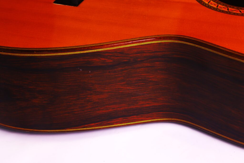 There are play marks and small dings on the top, back, sides, and the back of the neck—exactly what one expects from a guitar that has been used musically. None of these marks affect the guitar’s structure or performance.