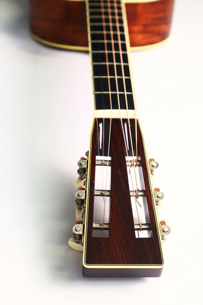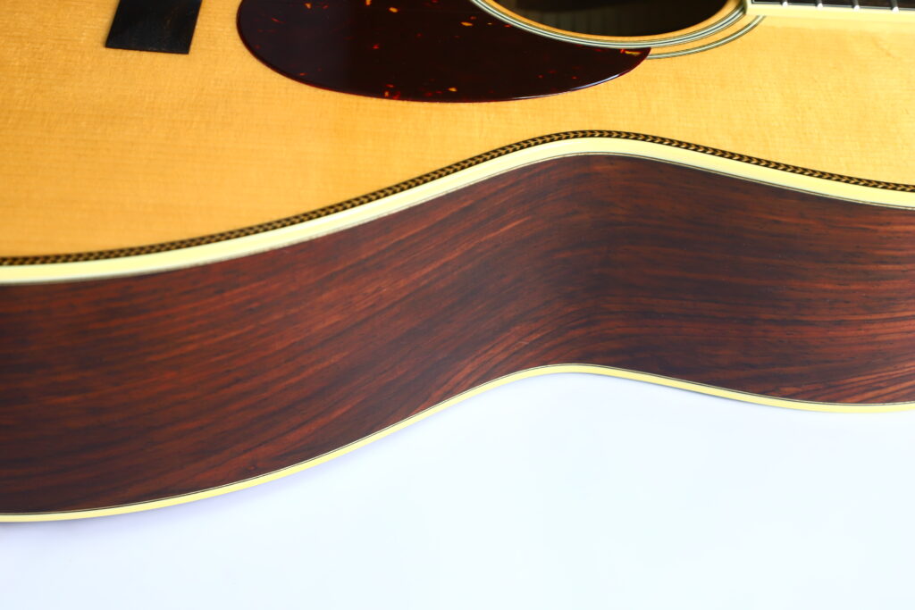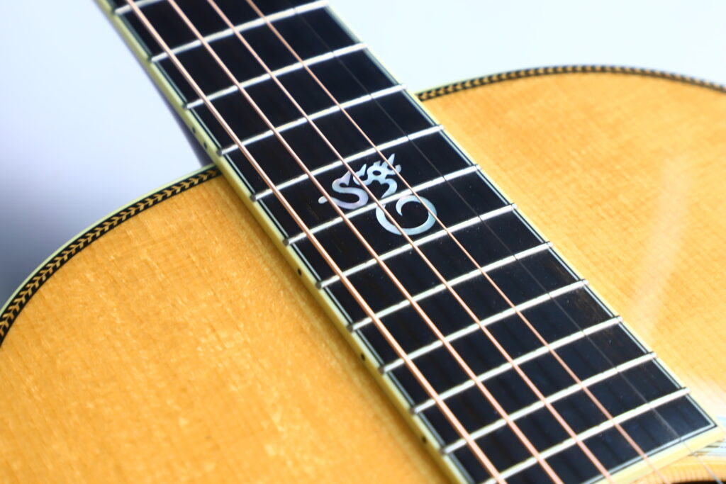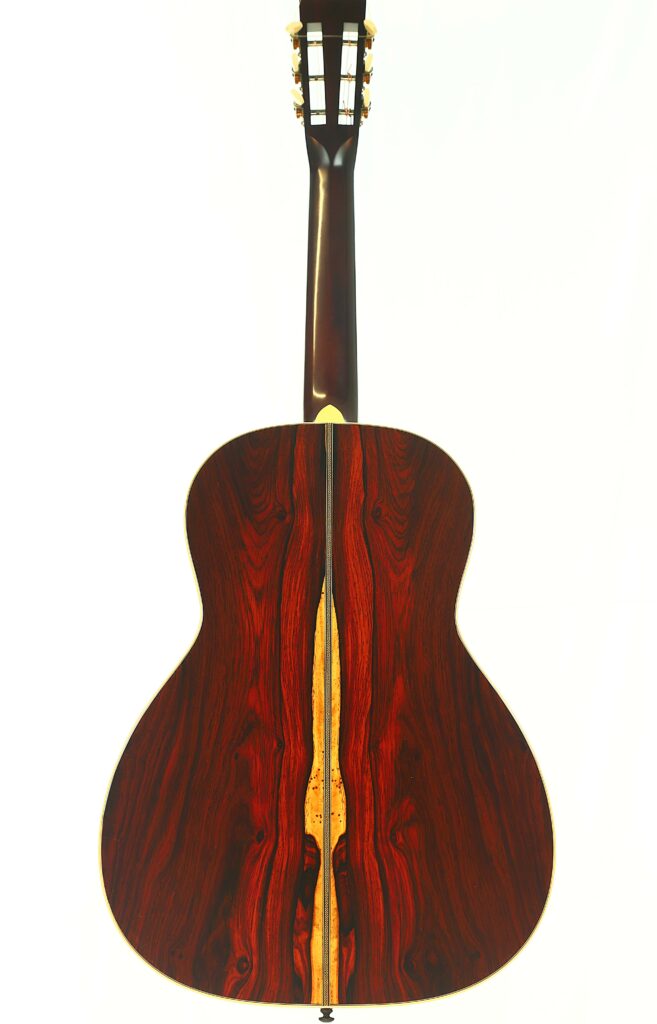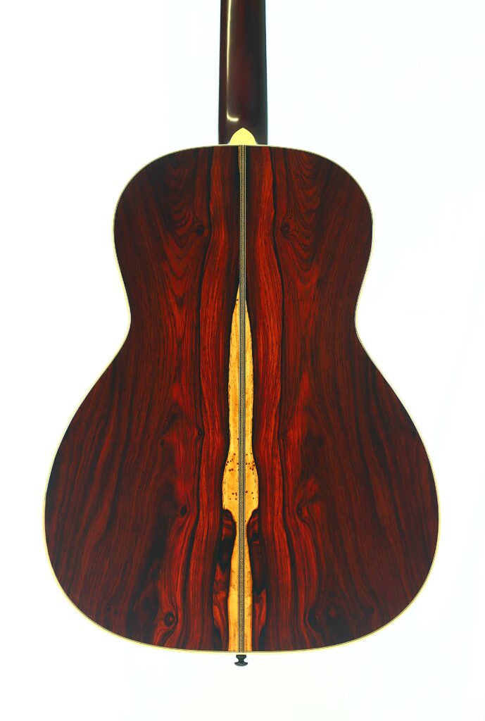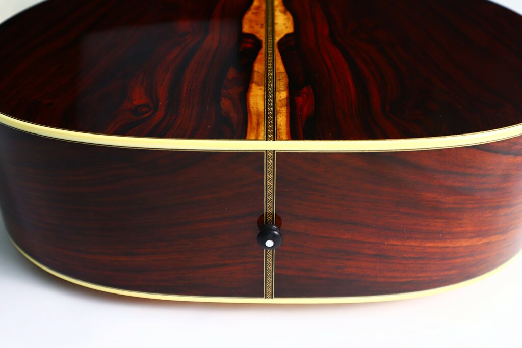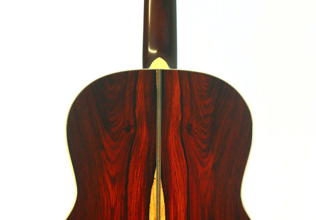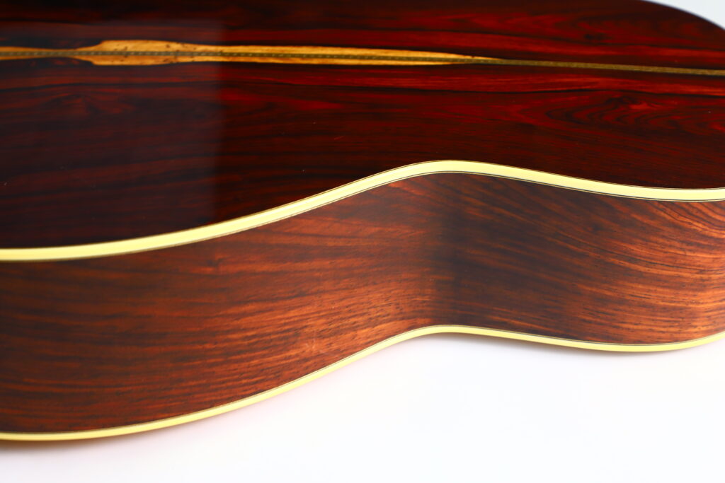 This stunning guitar showcases Eric’s unique vision, featuring a beautiful Cocobolo body paired with an Adirondack spruce top, resulting in a rich tonal palette that complements his distinctive playing style. The guitar boasts a unique 24.9-inch scale length, ensuring ease of play for intricate jazz passages, while its slightly deeper body enhances bass response and volume, making it perfect for dynamic performances.