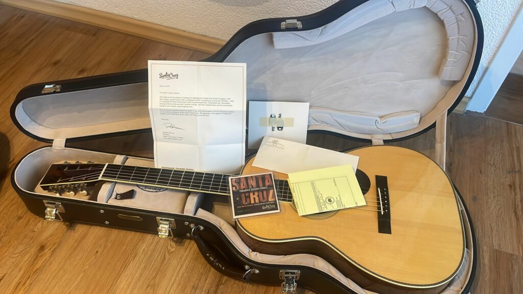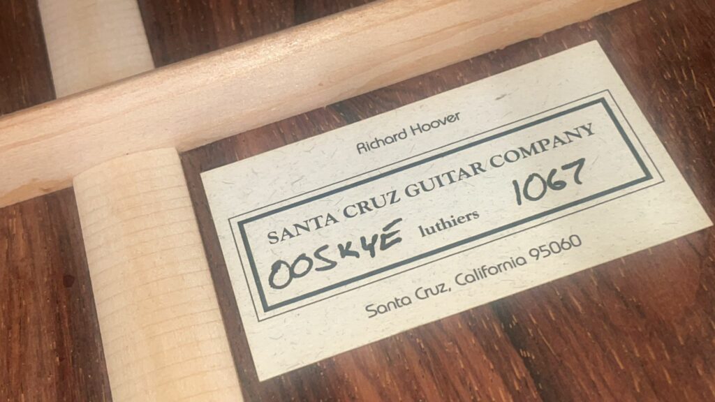 While this Santa Cruz 00-Skye acoustic guitar shows only minimal signs of play – it remains in excellent condition and retains its striking appearance. Included with the guitar are the original case and paperwork, ensuring that this exceptional instrument is ready for its next musical journey.