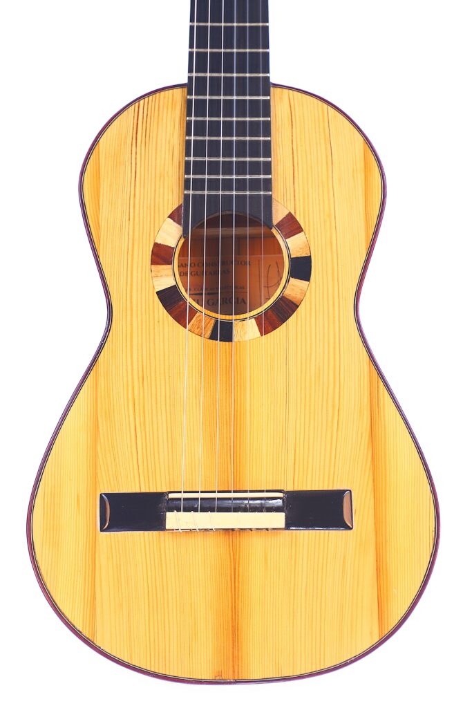 Antonio de Torres is known for his guitars with large bodies and the typical 7-fan bracing. Nevertheless, he also built guitars with smaller bodies and experimented with bracing. This guitar by Siscu Garcia embodies such a design, featuring the typical body of a romantic guitar but with fan bracing characteristic of Torres.