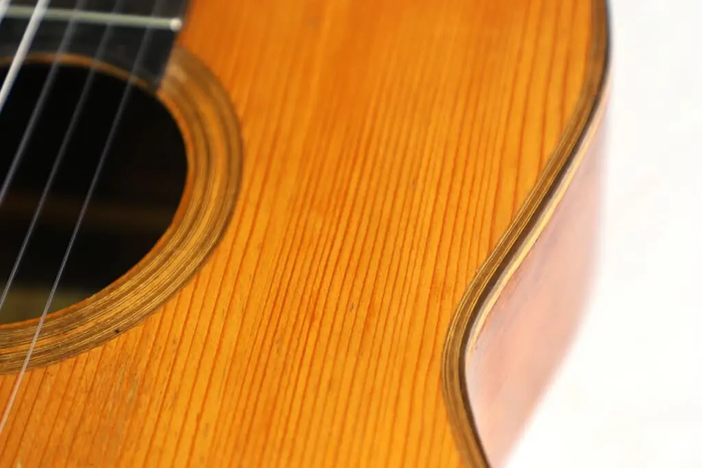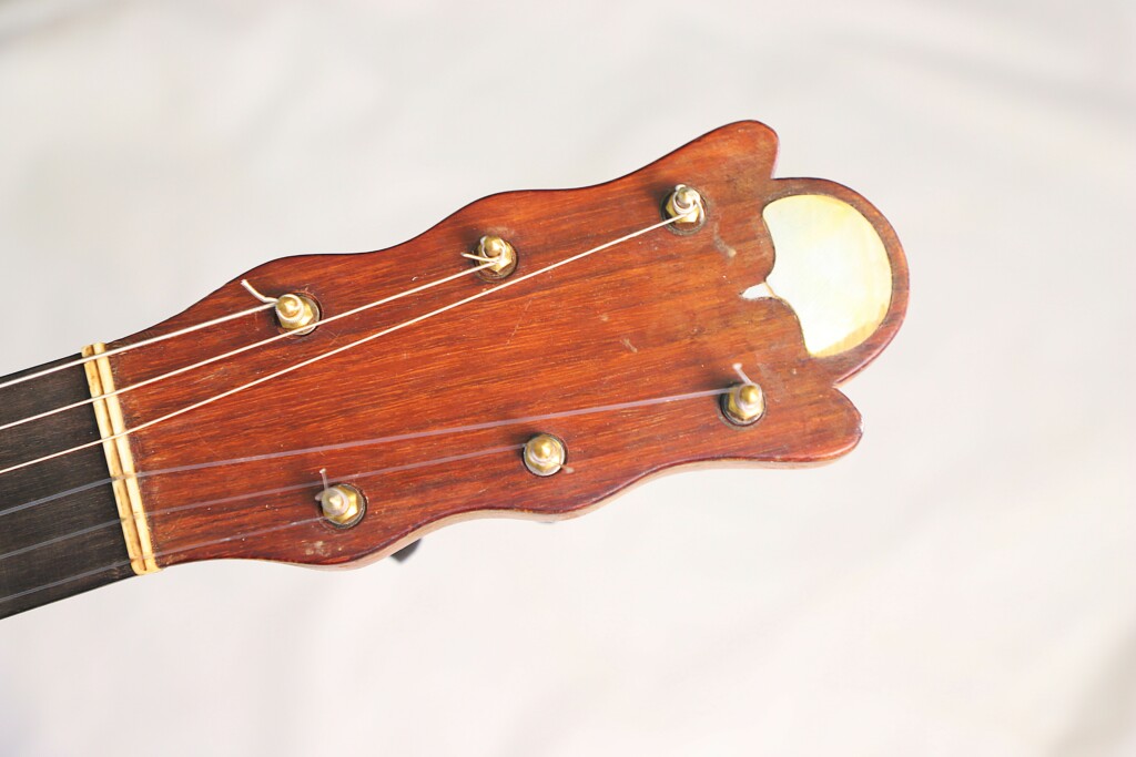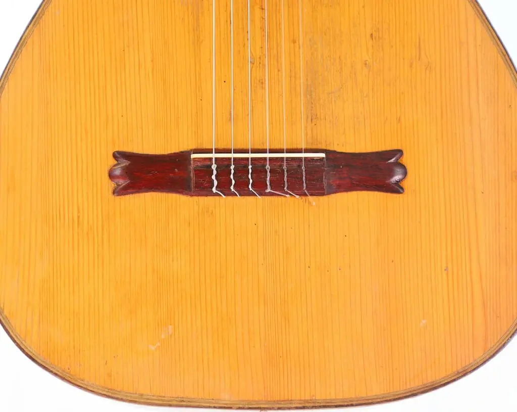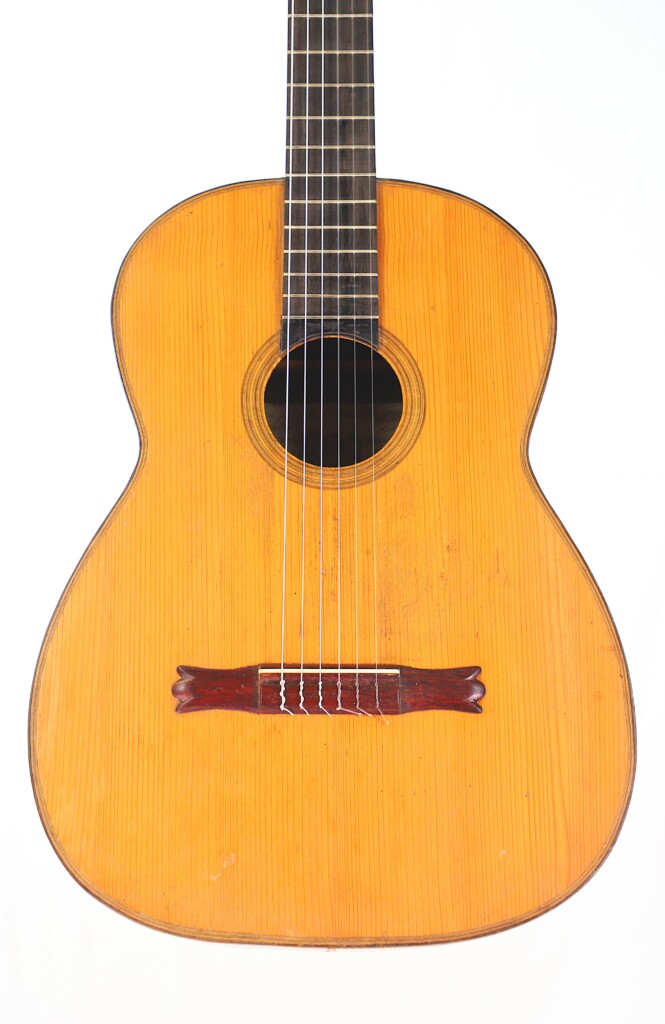 This fine Terraza Resonador was built by Salvador Ibanez in 1898. A photo associated with this guitar shows Regino Sainz de la Maza, who allegedly played and owned it, although this cannot be proven. The guitar features a very fine spruce top and beautiful rosewood back and sides. It has a 5-fan bracing pattern but does not have an additional resonator back. The models were apparently built with or without a resonator back, depending on the customer’s request. The scale length of the guitar is 645 mm, and the nut width is 50 mm. The string action is comfortably low at 3.5 mm for the low E string and 2.9 mm for the high e string at the 12th fret.