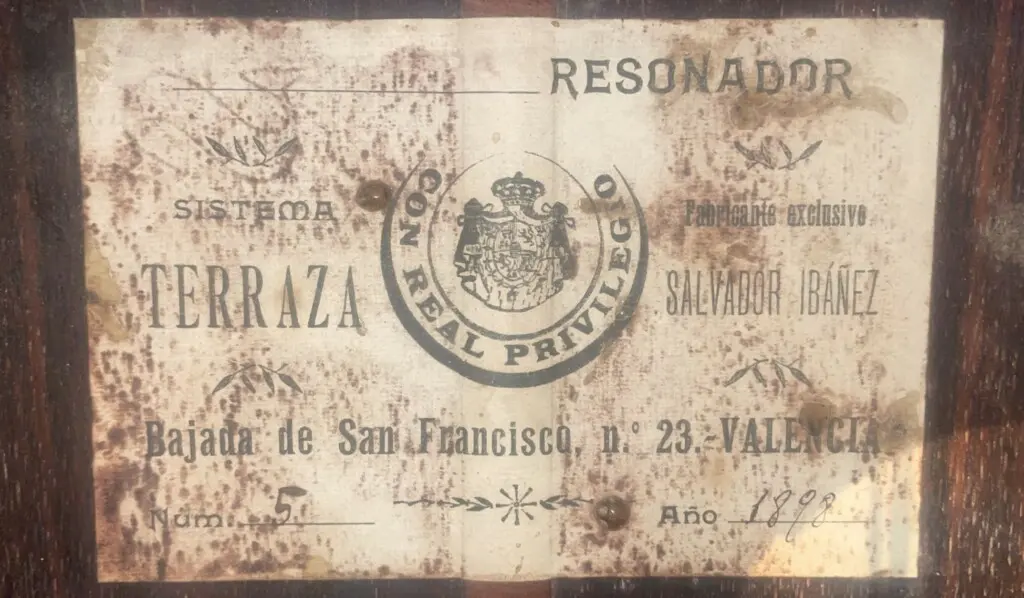 Terraza Resonador 1898 – an extremely rare guitar invented by Carlos Terraza and built by Salvador Ibanez. Francisco Tárrega played a Terraza Resonador from 1897. This guitar from 1898 was most likely owned by Regino Sainz de la Maza.
