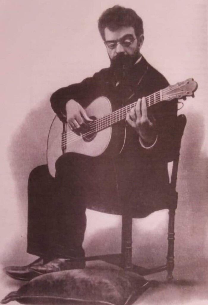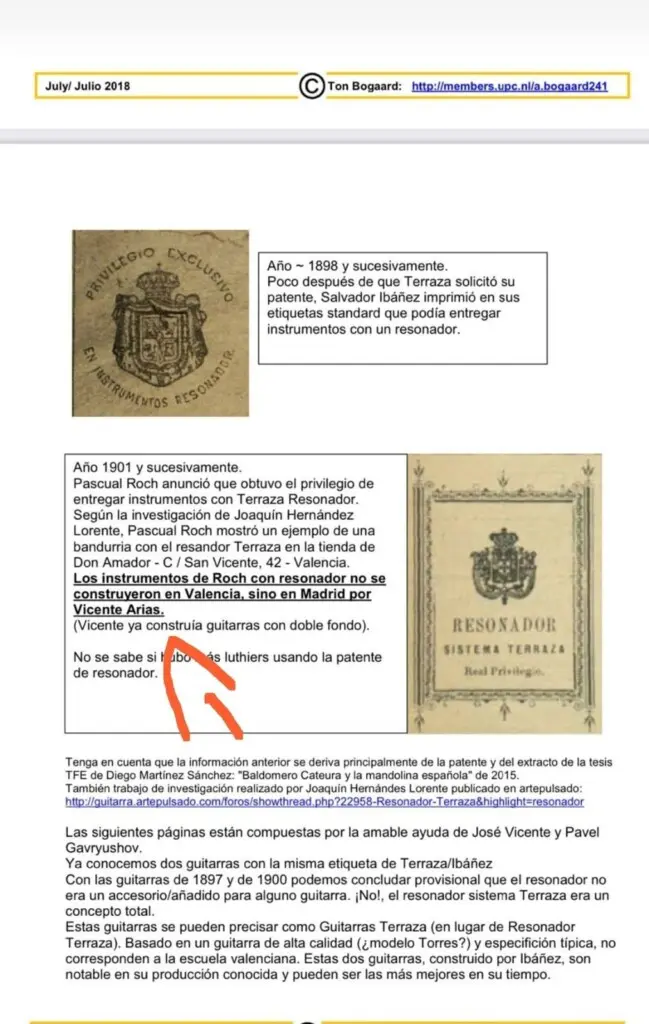 Carlos Terraza (1856–1916) is generally known as a Valencian bandurria player of the 19th century. However, he was also an innovator, having received several patents for the construction of guitars, bandurrias, and tuning devices. One of these patents was for a resonator for guitars and bandurrias. The fact that he included a drawing with his patent application shows that he was well aware of how to construct an instrument. It is said that Terraza became blind in his later years, which led him to collaborate with luthiers like Salvador Ibanez, and possibly Vicente Arias and others, to realize his designs.