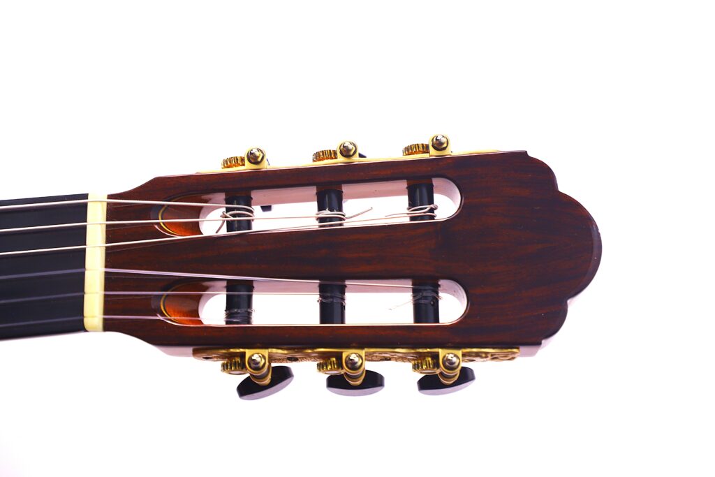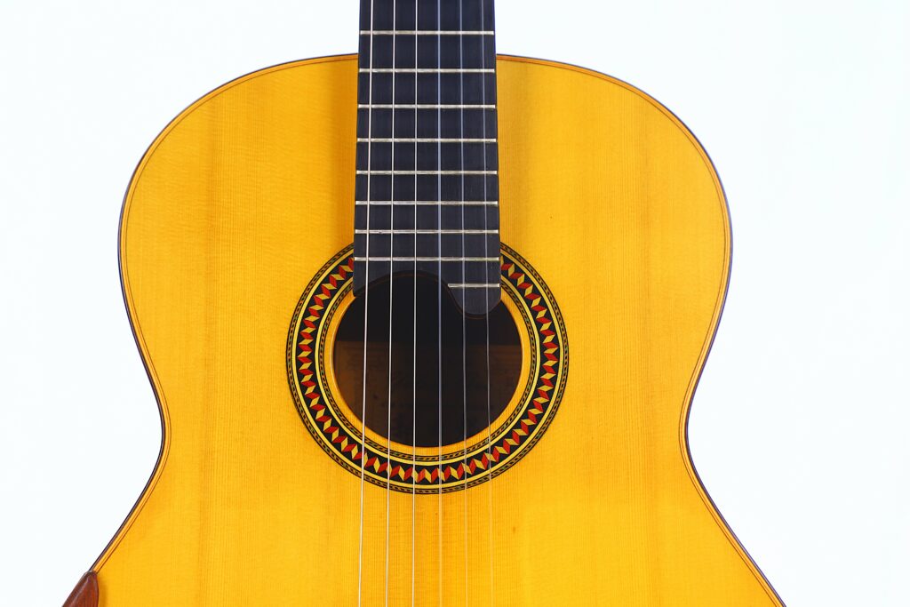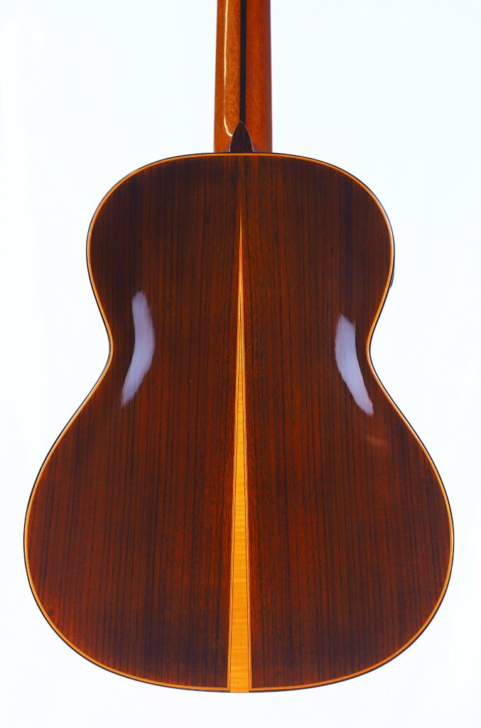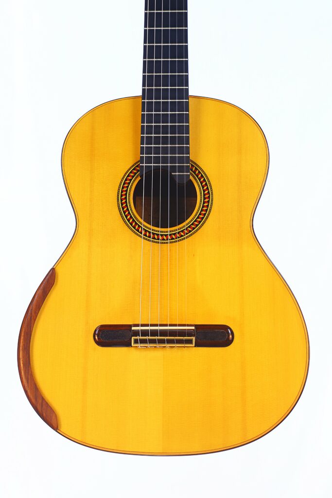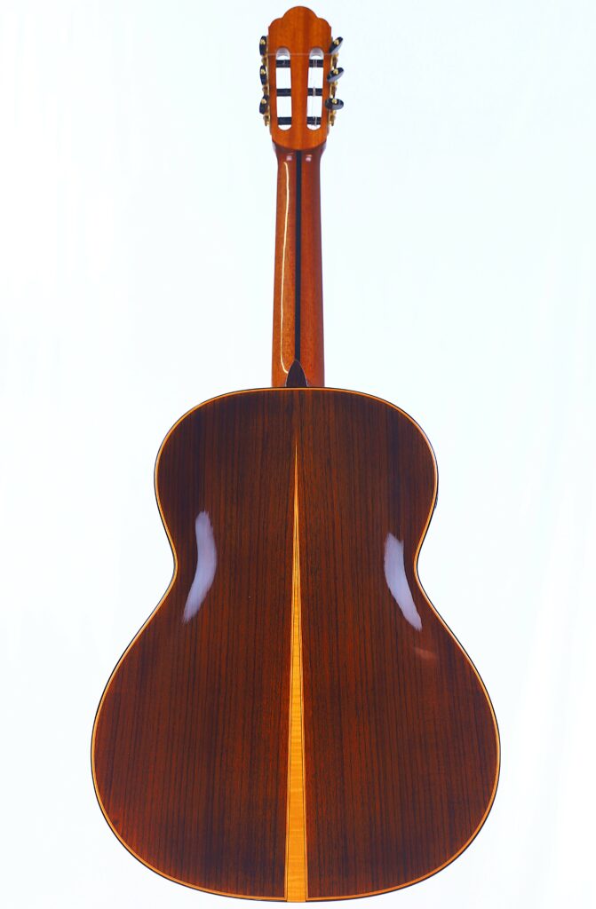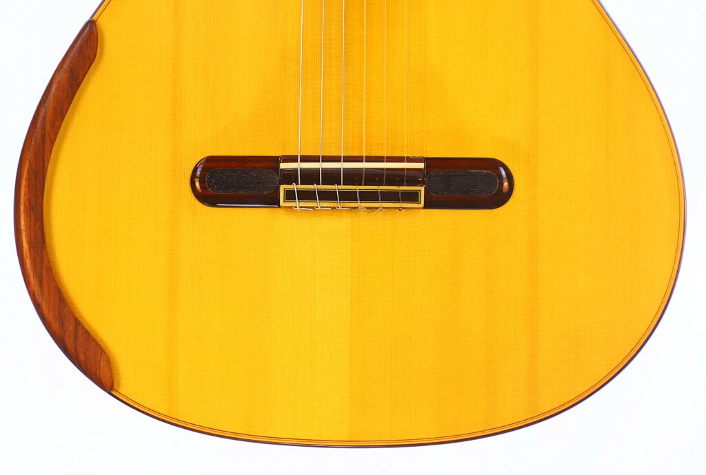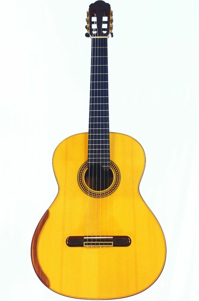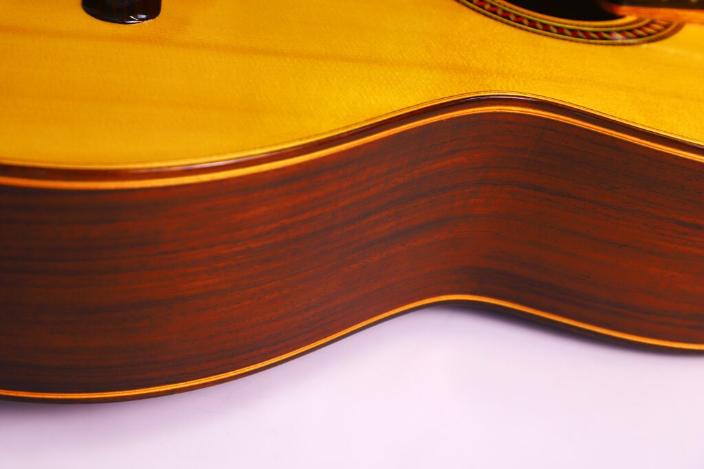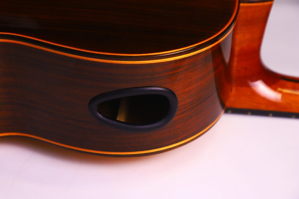 This YuLong Guo 2014 Chamber Concert classical guitar has a spruce top. It has an additional sound hole on the side near the heal of the neck. The vaulted “violin back” and the sides are made of rosewood and give the guitar an amazing volume and projection. An armrest made of rosewood, very flat frets and a low action make this guitar exceptionally easy and comfortable to play.