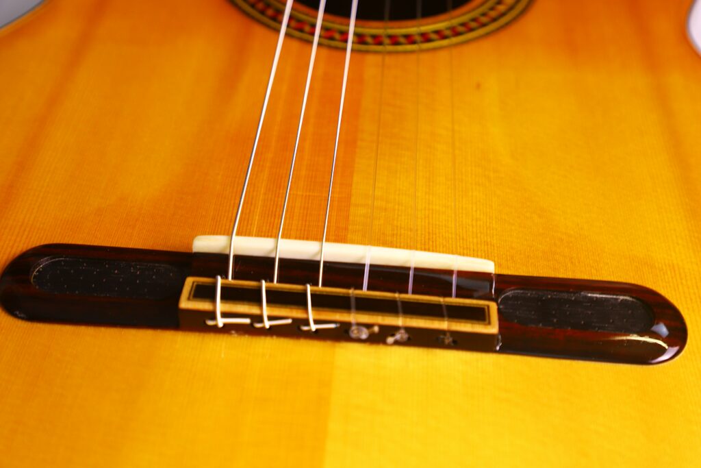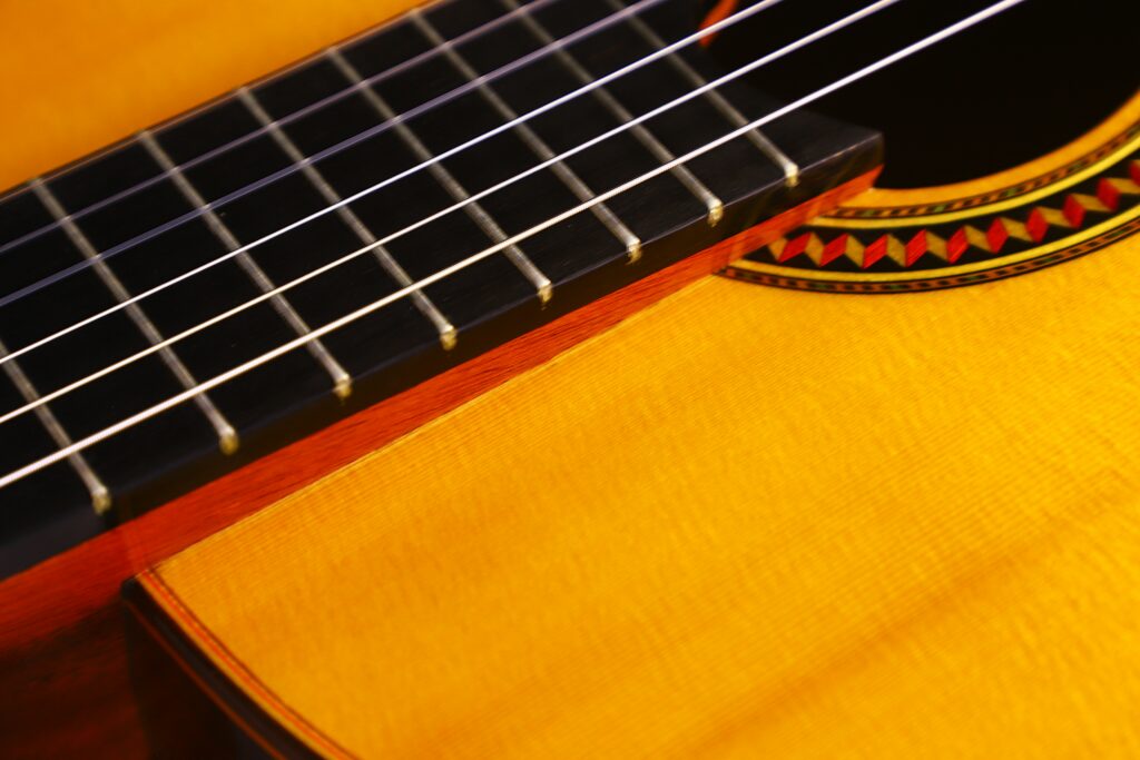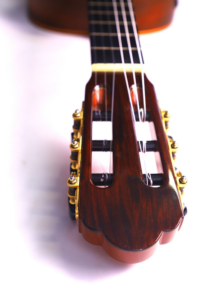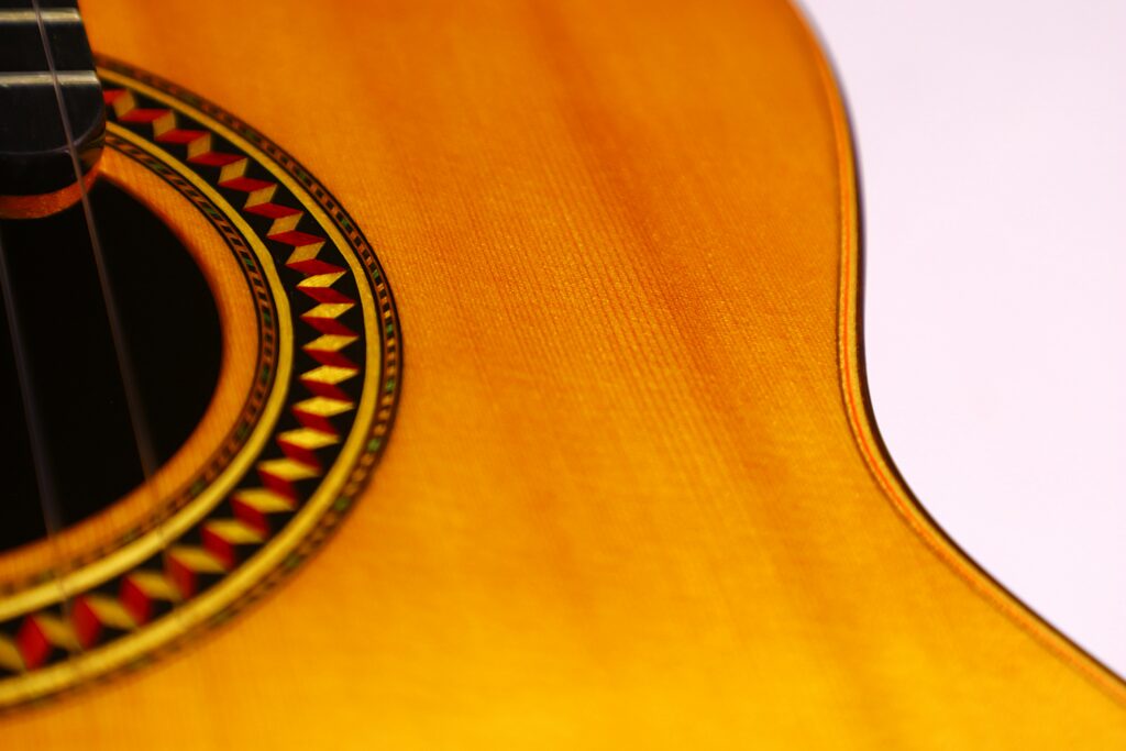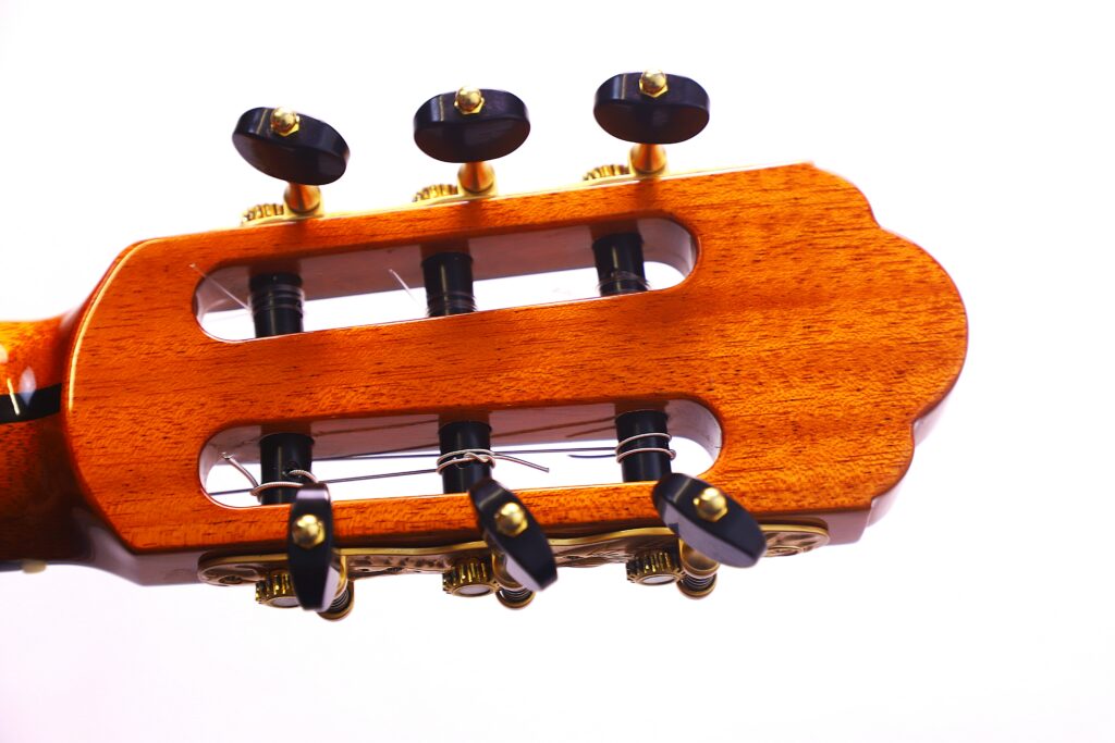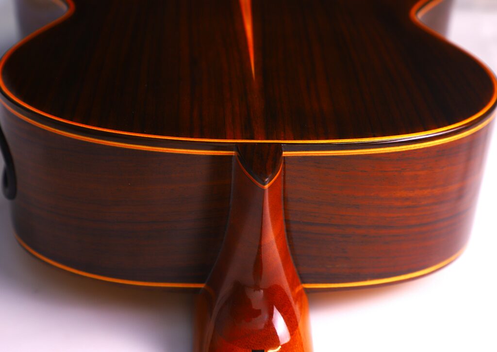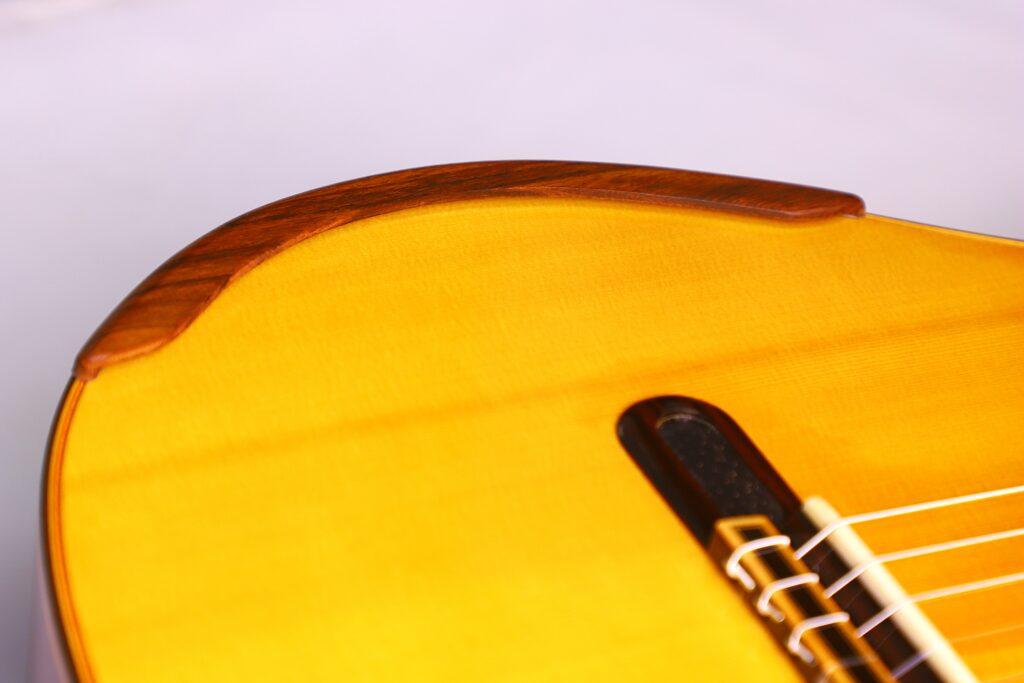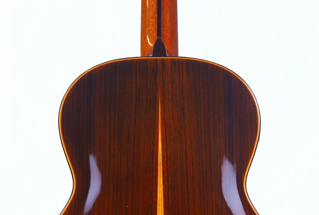 This YuLong Guo 2014 Chamber Concert classical guitar has a spruce top. It has an additional sound hole on the side near the heal of the neck. The vaulted “violin back” and the sides are made of rosewood and give the guitar an amazing volume and projection. An armrest made of rosewood, very flat frets and a low action make this guitar exceptionally easy and comfortable to play.
