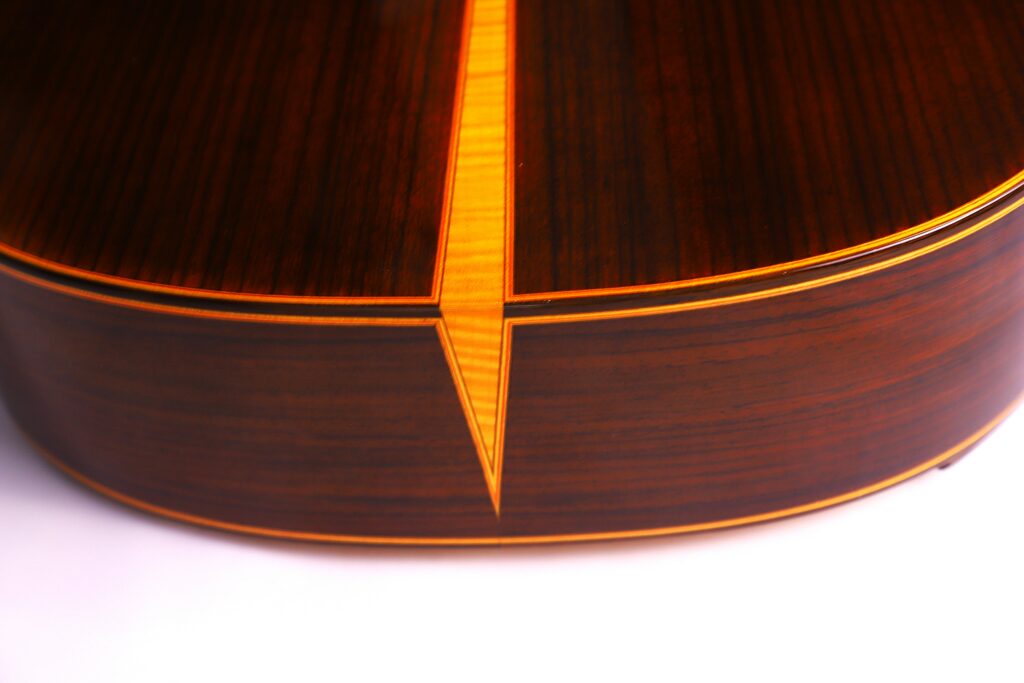 The Chamber Concert model by guitar builder Yulong Guo is a professional concert guitar of the highest standard. It is a lattice braced guitar with a bowed back, similar to the guitars of Greg Smallman. The craftsmanship of this Chinese builder is easy to recognize in the woodworking and painting and is also reflected in the wonderful acoustic characteristics of this beautiful guitar.