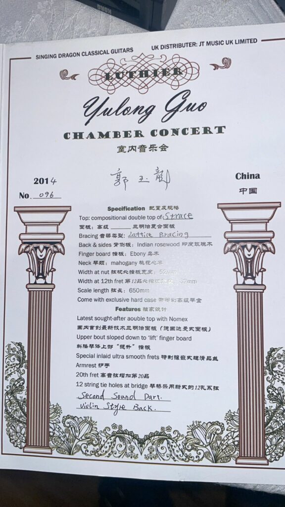 This YuLong Guo 2014 Chamber Concert classical guitar will be delivered with a non original guitar case.