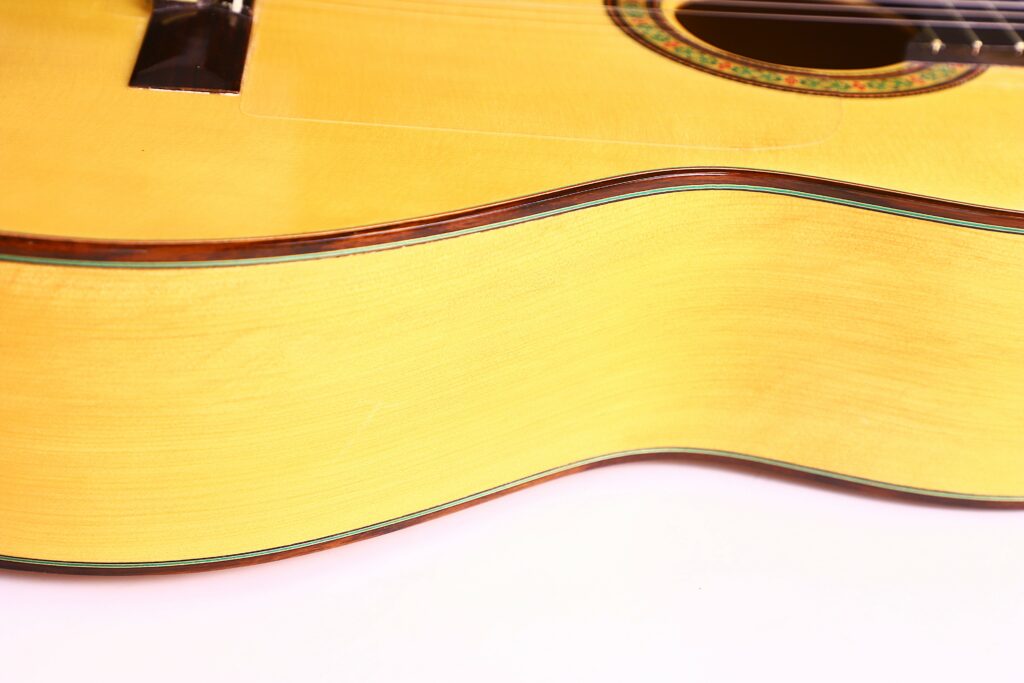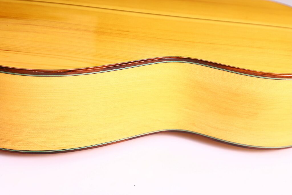 In terms of sound, this José M Palmero 2024 Flamenco Guitar exemplifies flamenco perfection. It produces a traditional flamenco tone characterized by a quick attack and a sharp, fiery edge that both captivates and inspires. The bass notes are rich and powerful, while the treble strings are crisp and articulate, striking an ideal balance between warmth and brilliance. Its dynamic range is remarkable: when played softly, it produces a sweet, melodic voice filled with warmth and depth. Conversely, when played with intensity, it unleashes a commanding, percussive bark that resonates with the passion and energy inherent in flamenco. This versatility makes it suited for both delicate expressions and vigorous, rhythmic strumming.