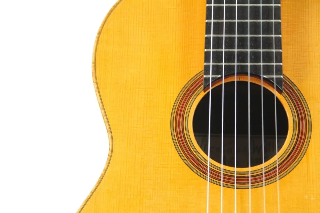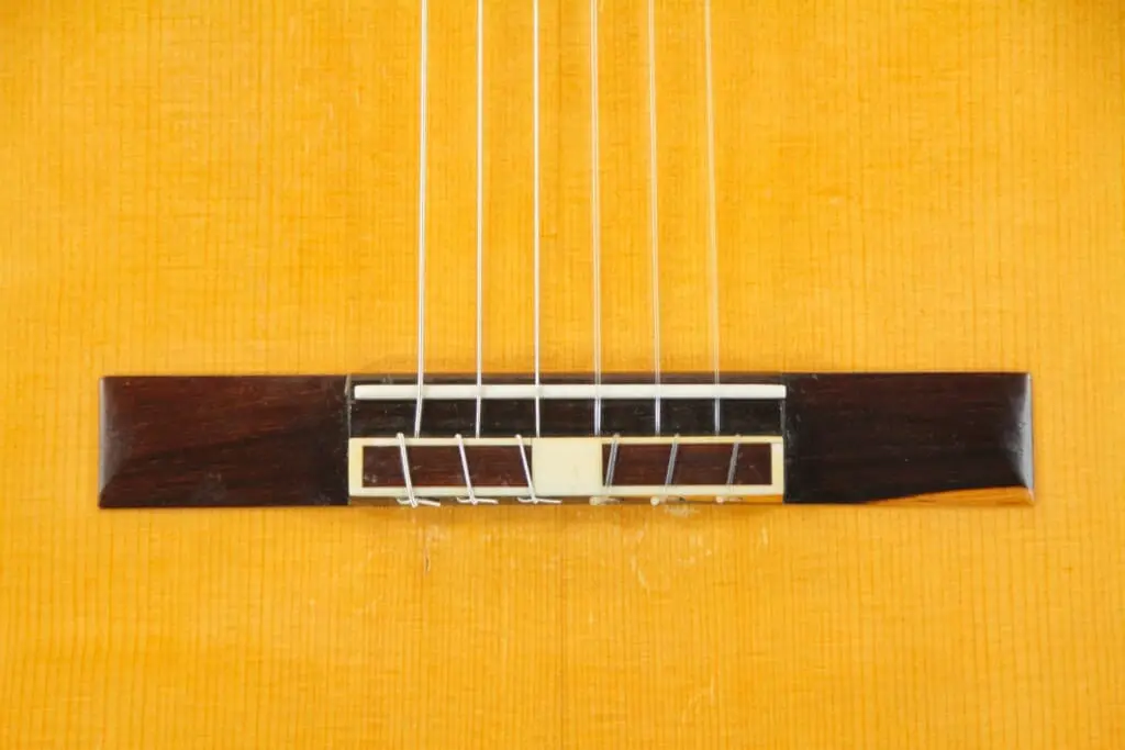 This guitar has an elevated fretboard and a free-floating bridge. This bridge construction is particularly nice, because it supports the vibration behavior of the soundboard and thus elementally enhances the sound.