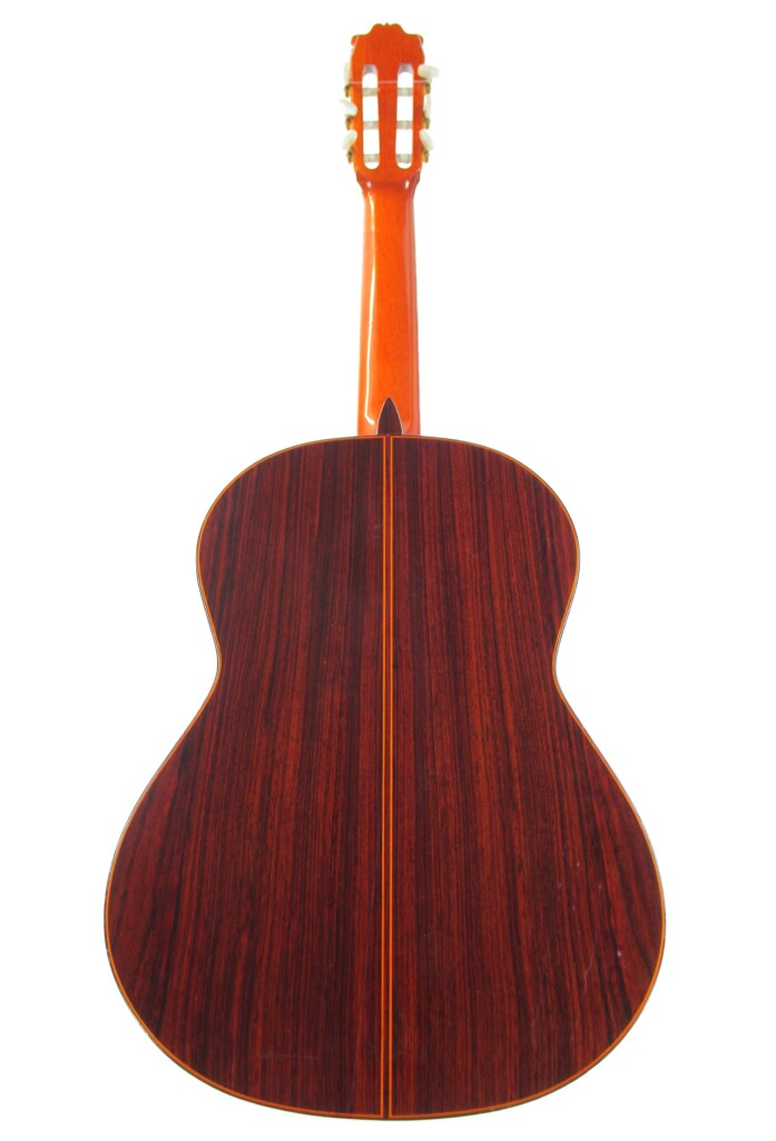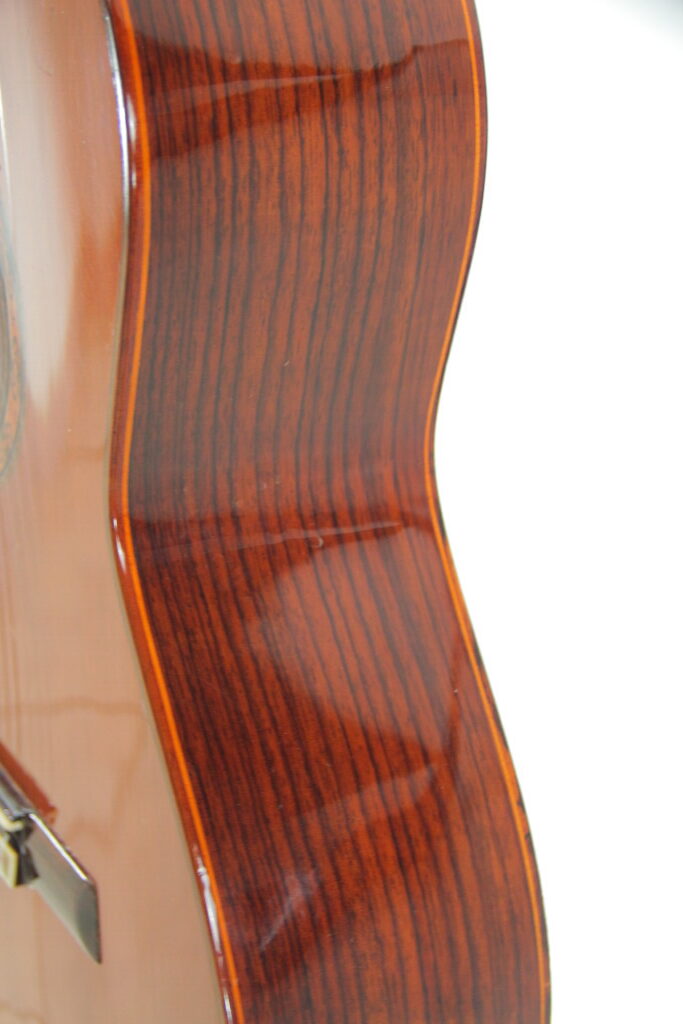 This particular guitar, labeled “Casa Arcangel Fernandez,” was built in this renowned workshop according to Arcangel’s exacting specifications. It features a beautifully aged cedar top, paired with rich rosewood back and sides. These premium tonewoods contribute to the guitar’s remarkable depth and warmth, creating a sound that is both powerful and refined. With a scale length of 655 mm and a nut width of 53 mm, the guitar offers a comfortable and natural playing experience, allowing for effortless expression.