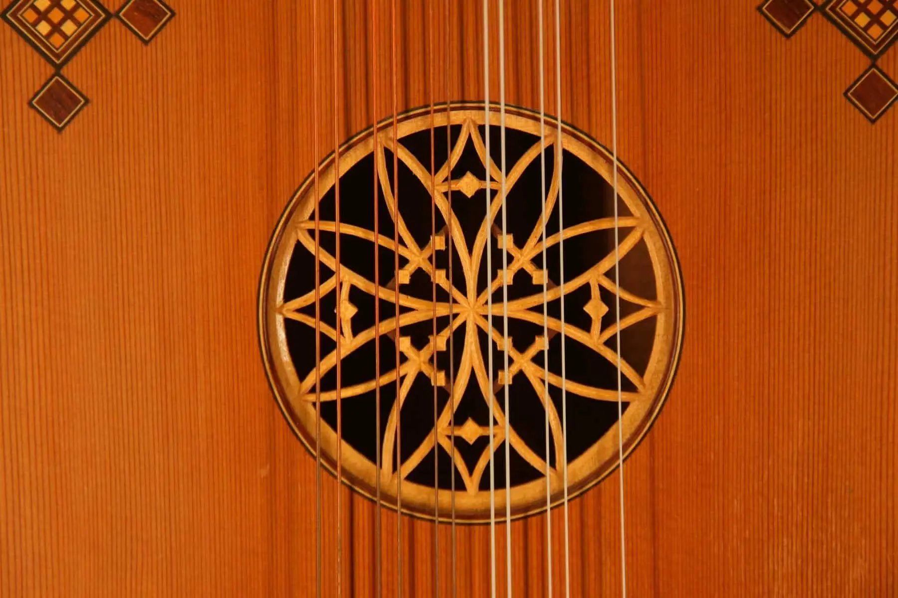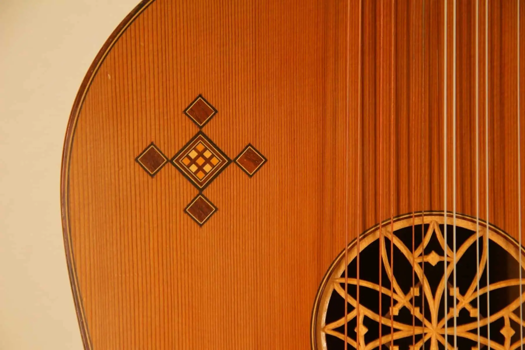 It has a 65 cm scale length and 55 mm nut width. The top is made of spruce and the back and sides of maple. The instrument is 6-course and has all kinds of beautiful inlay work, including this stunning handmade inlay in the soundhole.