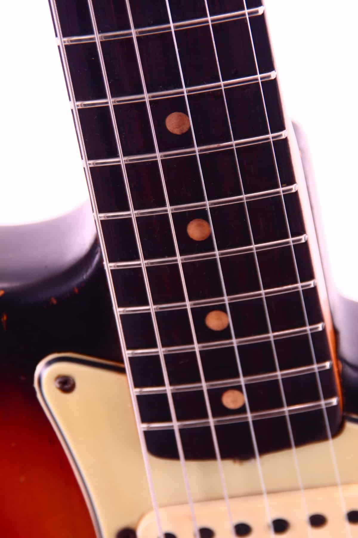 This Fender Stratocaster 1964 Electric Guitar was built in 1964 and painted with a 3-tone sunburst finish. It is a well played and loved instrument and as a result the original finish has a cool vintage look.