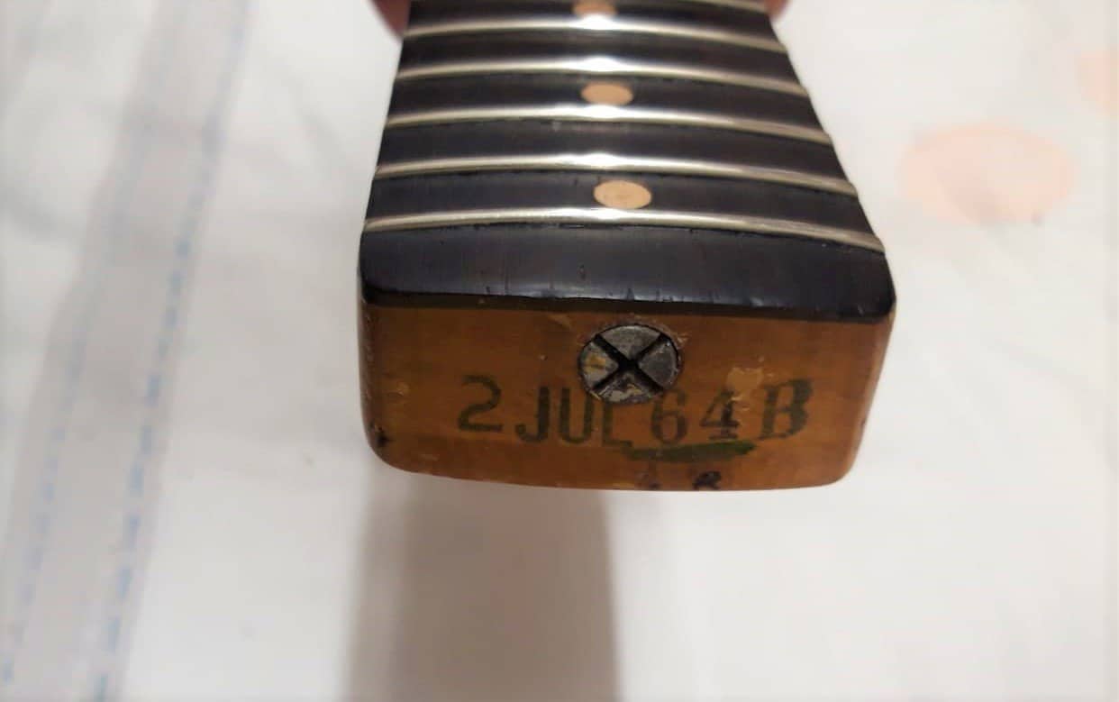 This Fender Stratocaster 1964 Electric Guitar is all original and weights 3.4 kg. It has received a refret and a new nut (old nut included). The previous owner has glued some transparent tape on the back to prevent the original finish from further damage – we found that cool and left it like that, because it is somehow part of this guitars personal and moved history. It surely could be removed with professional help – this is up tothe new owner. The 3-way switch has been changed for a 5-way switch (original switch included). It comes with the original trem arm, the original strap. 2 latches of the original case are broken.