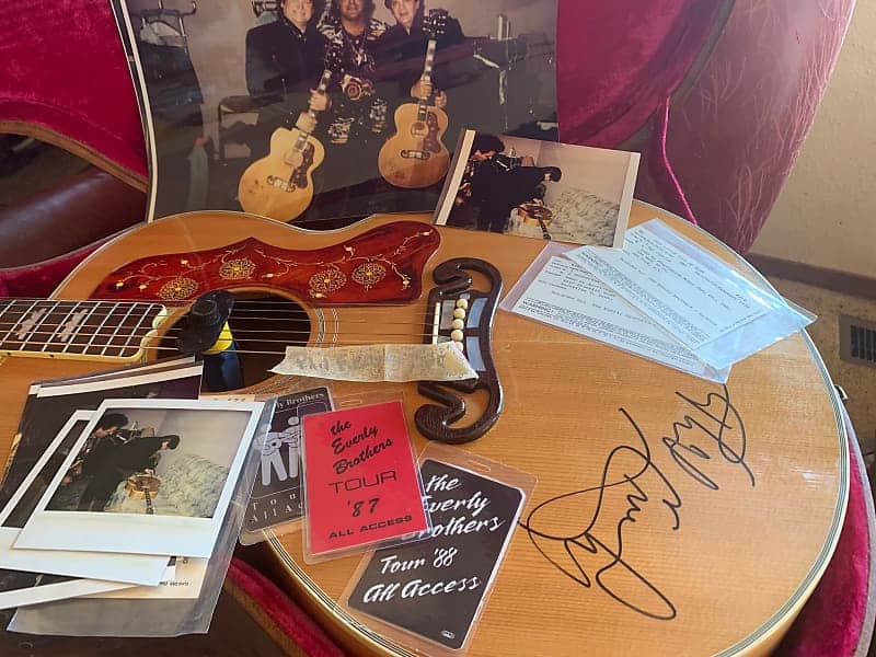 A rare beauty – this Gibson J-200 1956 has been played by Phil Everly of the Everly Brothers during some of their tours. Many pictures and original accessories are included. The guitar was signed by Phil Every and is therefore a rarity and an absolute must for all Everly fans!