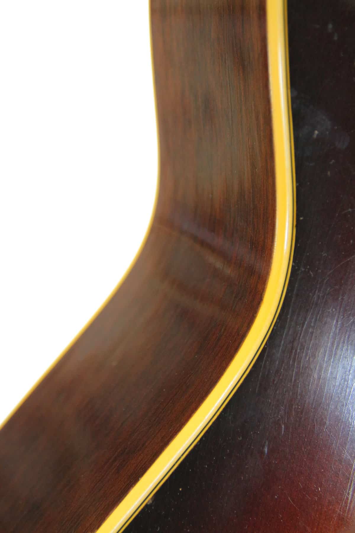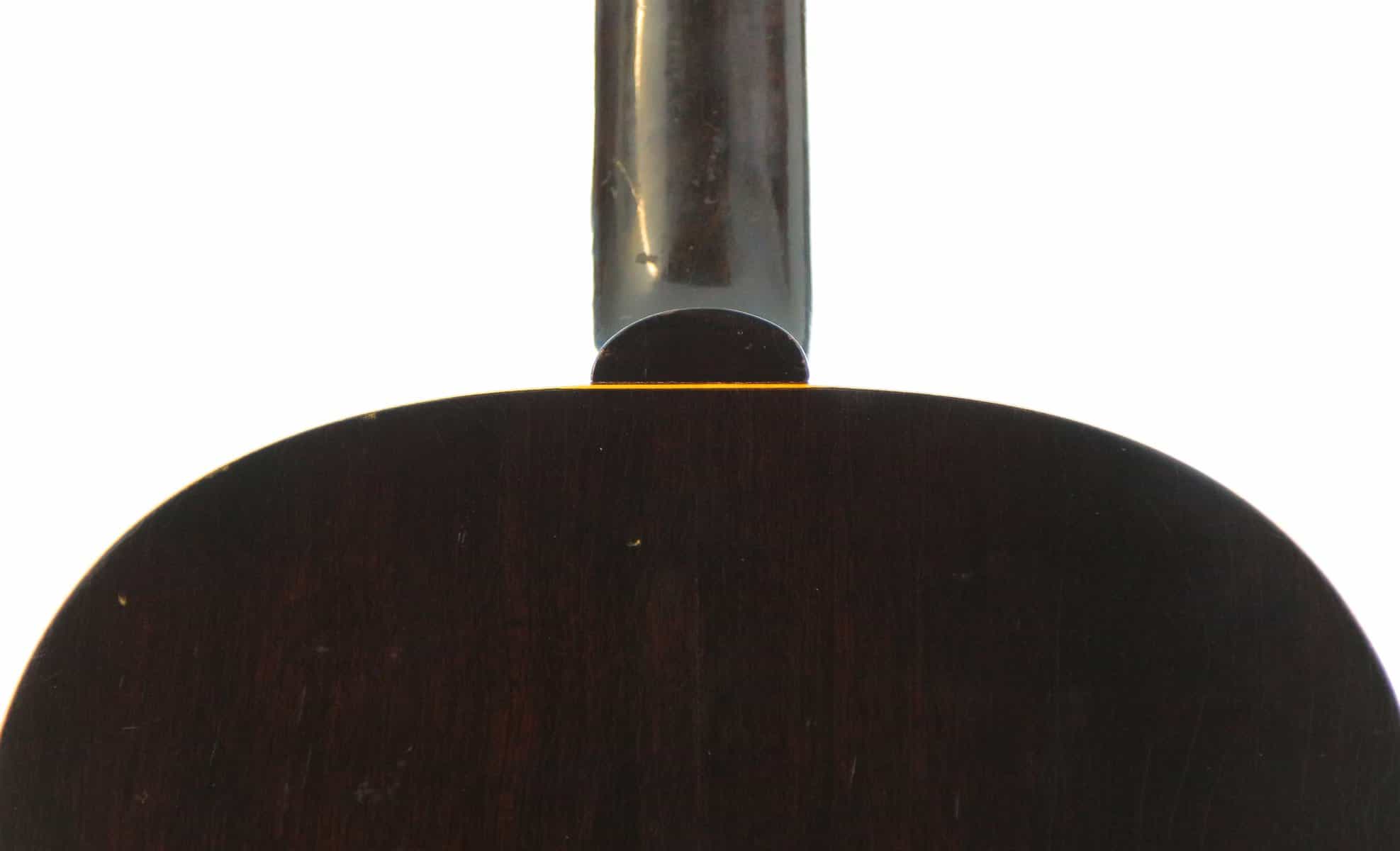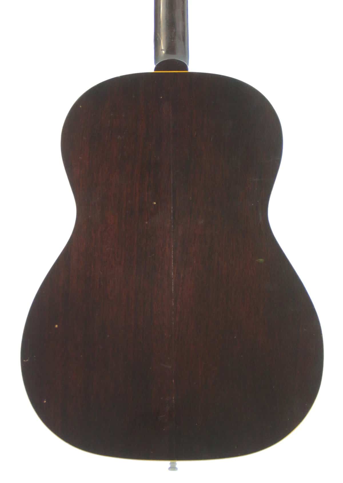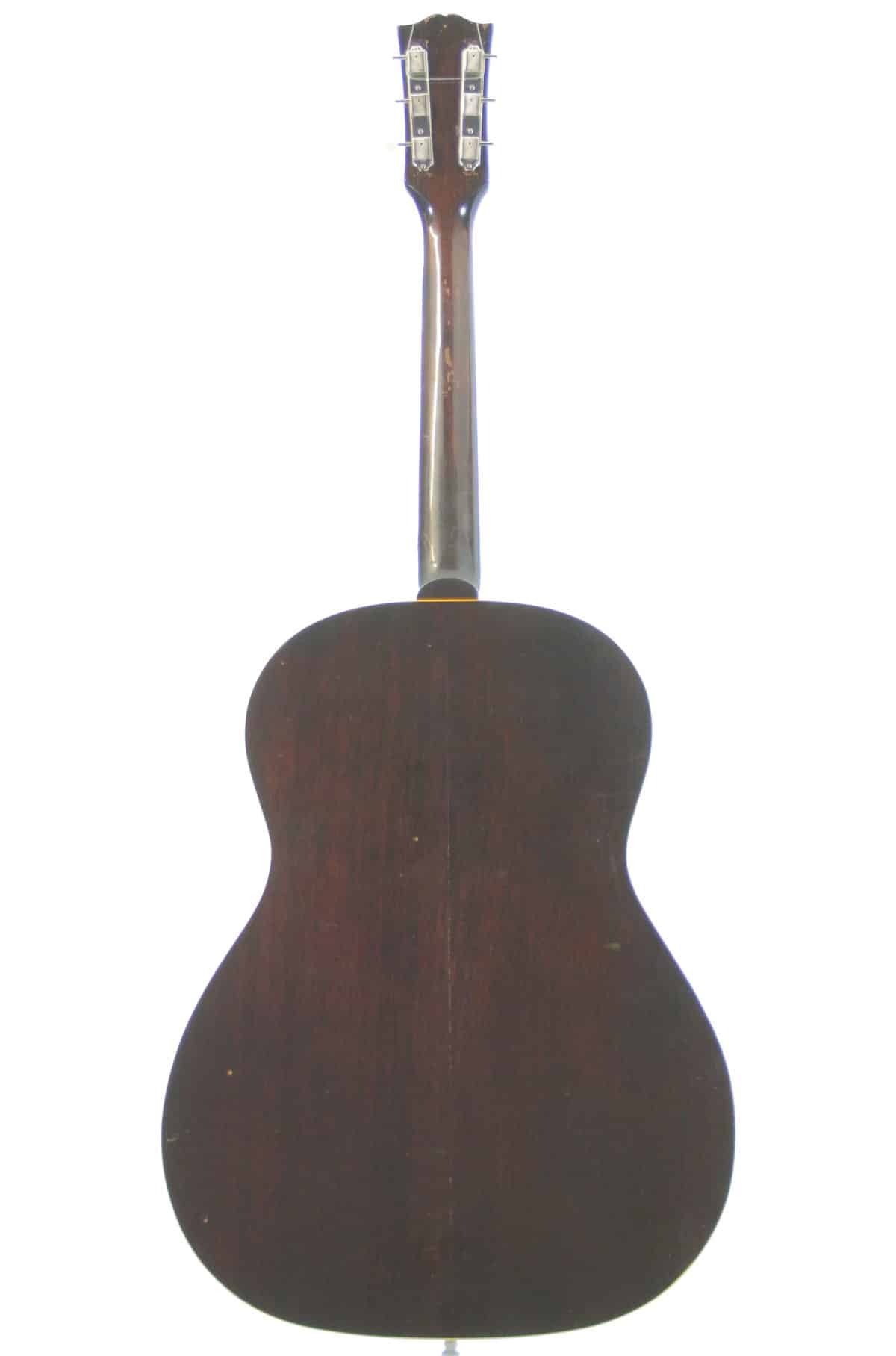 This nice guitar solid spruce and mahogany construction, with a nicely aged warm sunburst finish, a mahogany neck topped with a rosewood fingerboard, a rosewood bridge. It has vintage style replacement tuners.