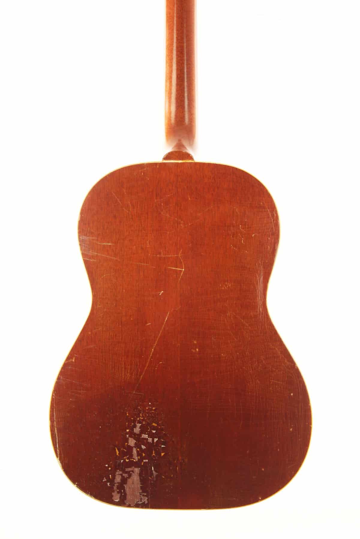 This nice guitar solid spruce and mahogany construction, with a nicely aged warm natural finish, a mahogany neck topped with a rosewood fingerboard, a rosewood bridge. It has the original Kluson tuners too.