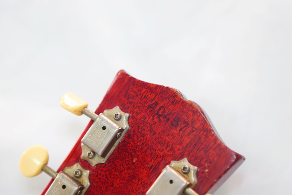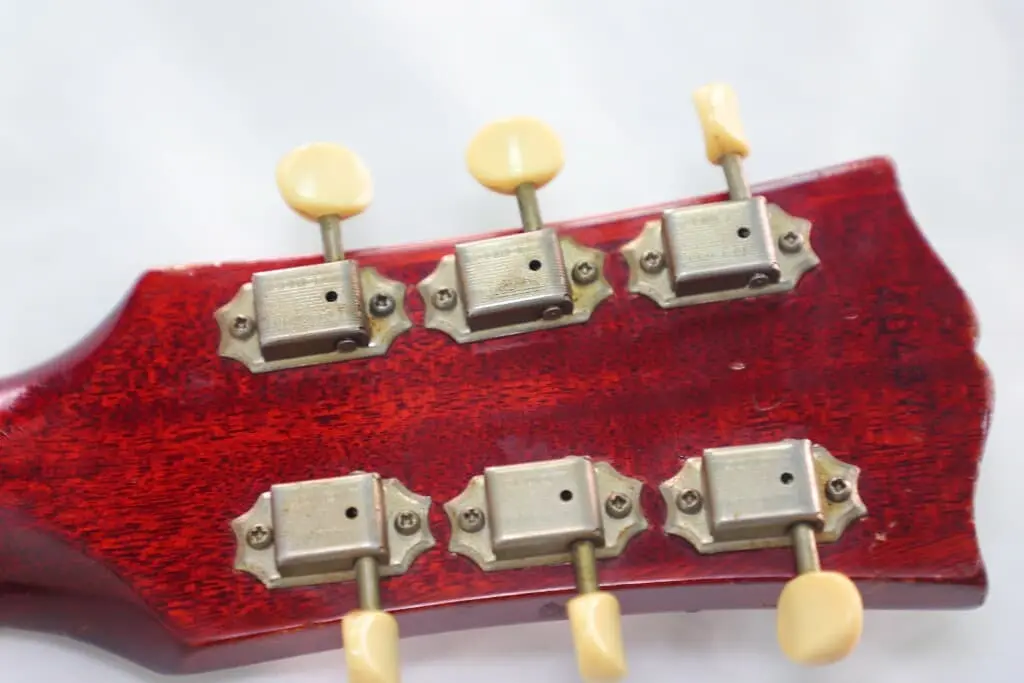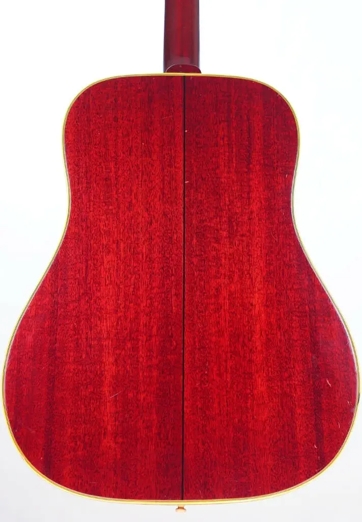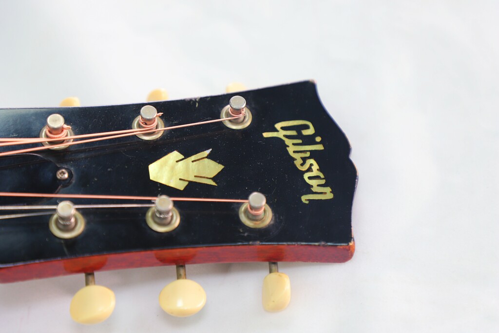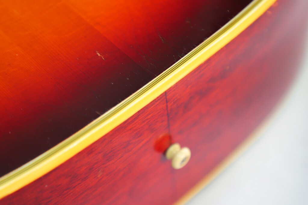 The mahogany neck with a rosewood fingerboard offers a smooth transition between frets and an authentic playing experience. The original plastic inlays and classic sunburst finish enhance the guitar’s timeless appearance.