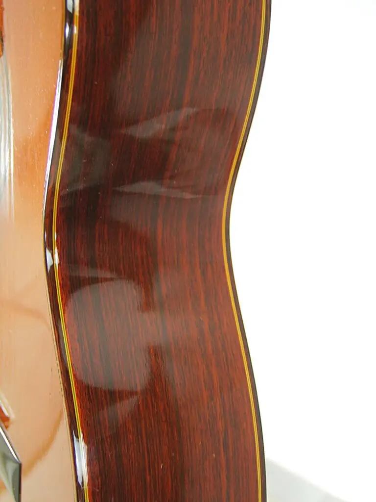 This Hirade Master Arte Model 7 is a wonderful example of the outstanding quality of Japanese guitar making. The guitar has a cedar top and rosewood back and sides. The scale length is 660 mm and the nut width is 54 mm. The overall construction of the guitar reminds us strongly of Kohno’s guitars.