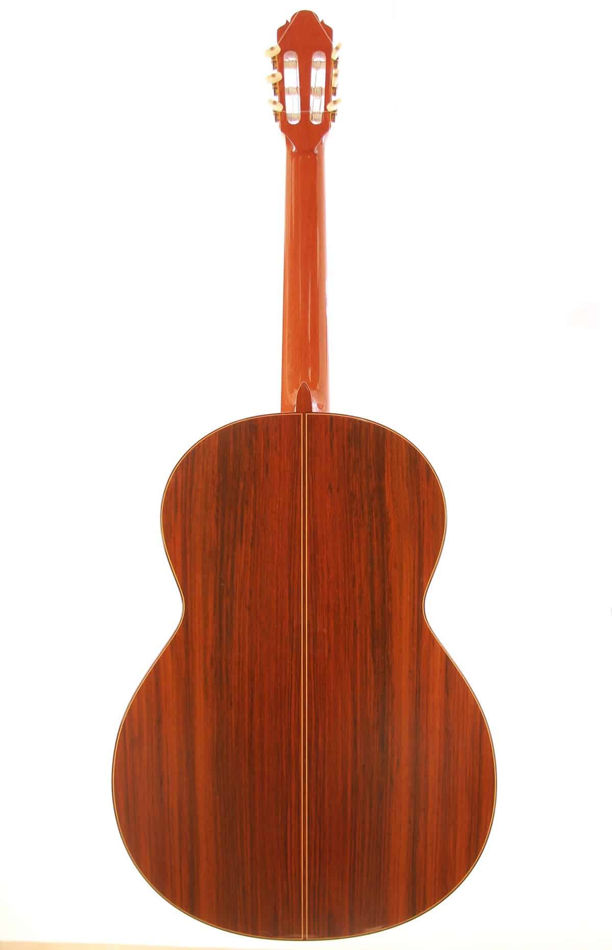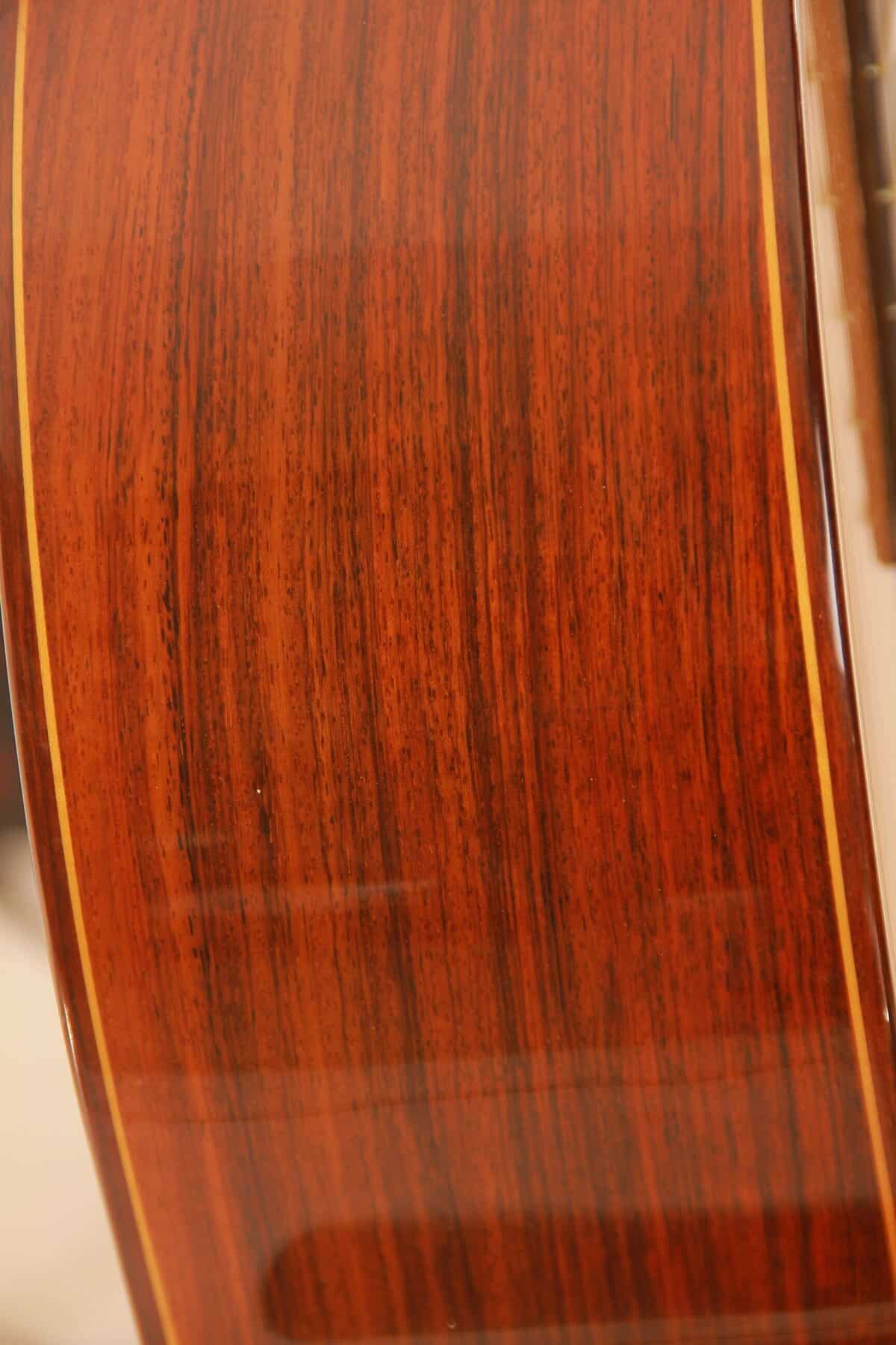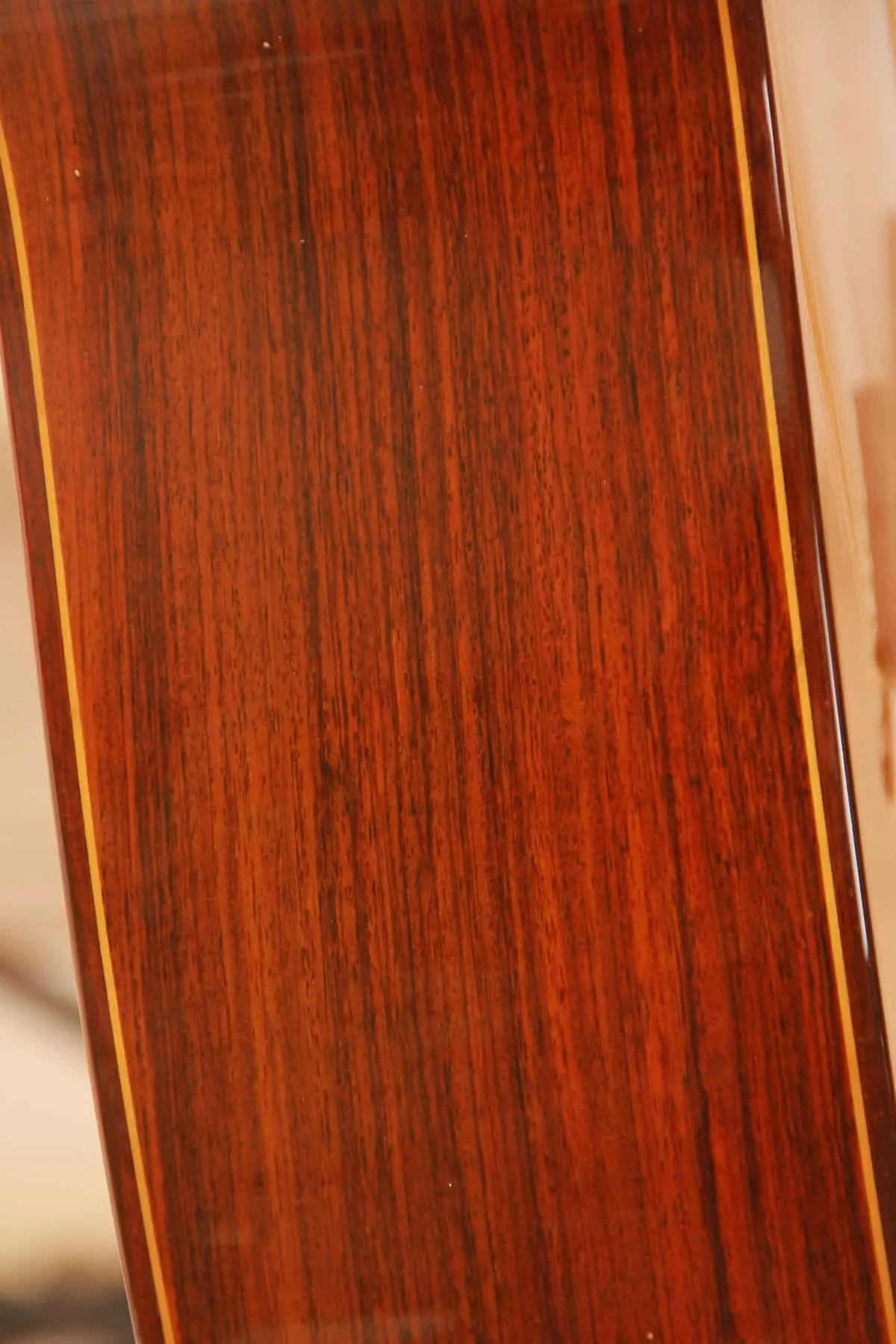 This guitar has a spruce top and back and sides: of East Indian rosewood. The scale lengths is 750 mm and the nut width 53 mm.