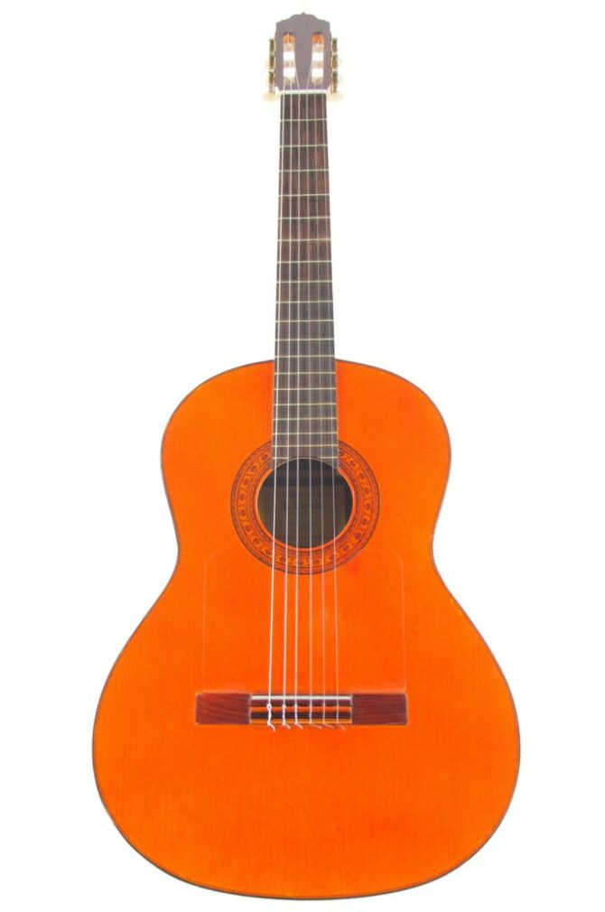 This guitar was built by Cayuela in 1978. It has a spruce top. While the sides are cypress the back looks to us as built from mahogany. The scale length is 655 mm and the nut width 52 mm.
