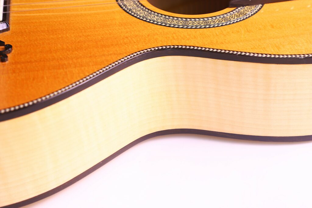 This Jesus Magdalena Martin 2021 Lacote Romantic Guitar is very well built and has a cedar top and beautiful maple back and sides.