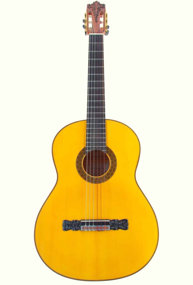 This guitar is actually the last guitar Pedregosa made before he retired. It is simply magnificent and a work of art. It is a special model, with carved headstock, carved bridge and a beautiful decorations all around. The amount of work involved is huge and only a master could do it. The woods of this guitar are of extreme quality. It features a spruce top and cypress back and sides. The scale length is 650 mm and the nut width 52 mm.