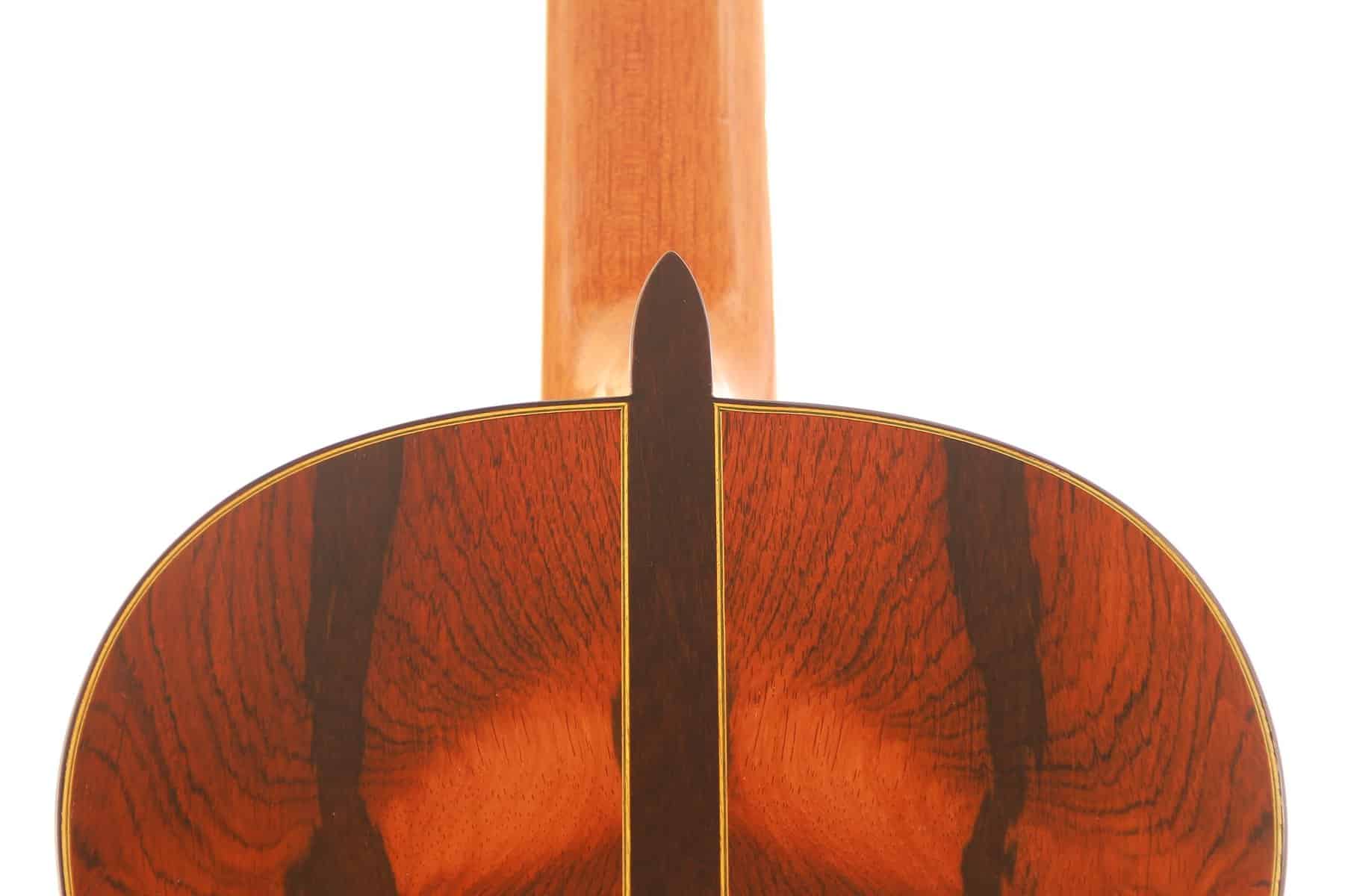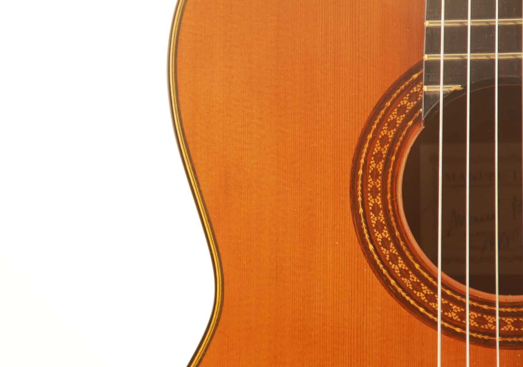 This Manuel Bellido classical guitar is truly one of a kind. It has a doble tapa design. Similar to Manuel Contreras’ guitars, it has a double back made of rosewood on the outside and cedar on the inside (the two pieces of wood are glued together).