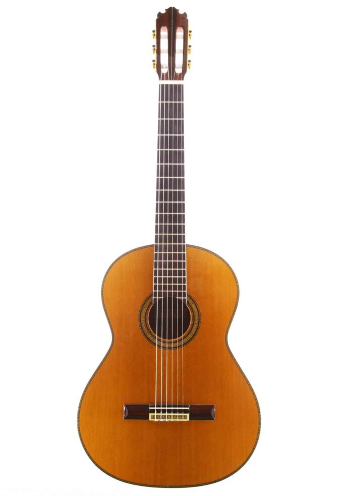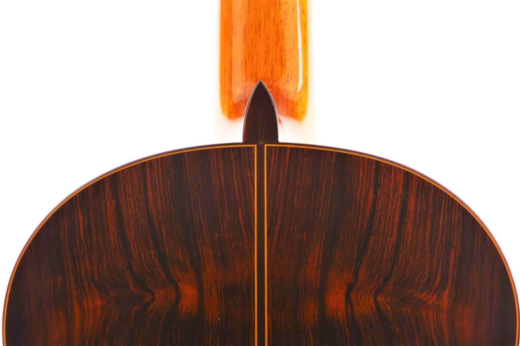 The Contreras Double-Top is perhaps his best-known and most sought-after design. Several players have performed on this model since the 1980’s, including the Romeros. The name “double-top” is actually a slight misnomer: in Spanish “tapa” means “cover” and actually refers to an additional piece of wood that is “covering” the inside of the back. So in reality, the back (not the top) is doubled-up, with a rosewood exterior and cedar interior (the two pieces of wood being glued together). This is in line with the Madrid school of using double sets of wood – Ramirez lines the sides of their 1a models with cypress and Bernabe & Teodoro Perez of course use double sides on several of their top models.