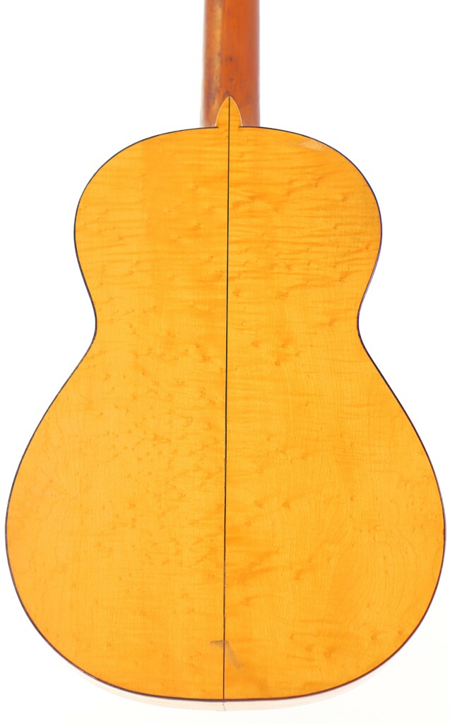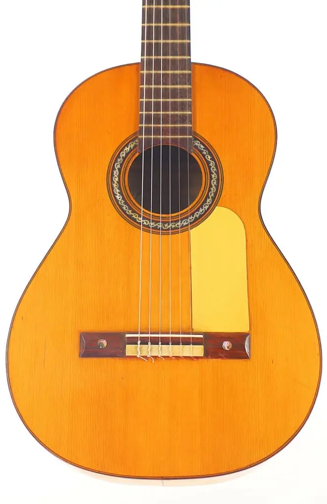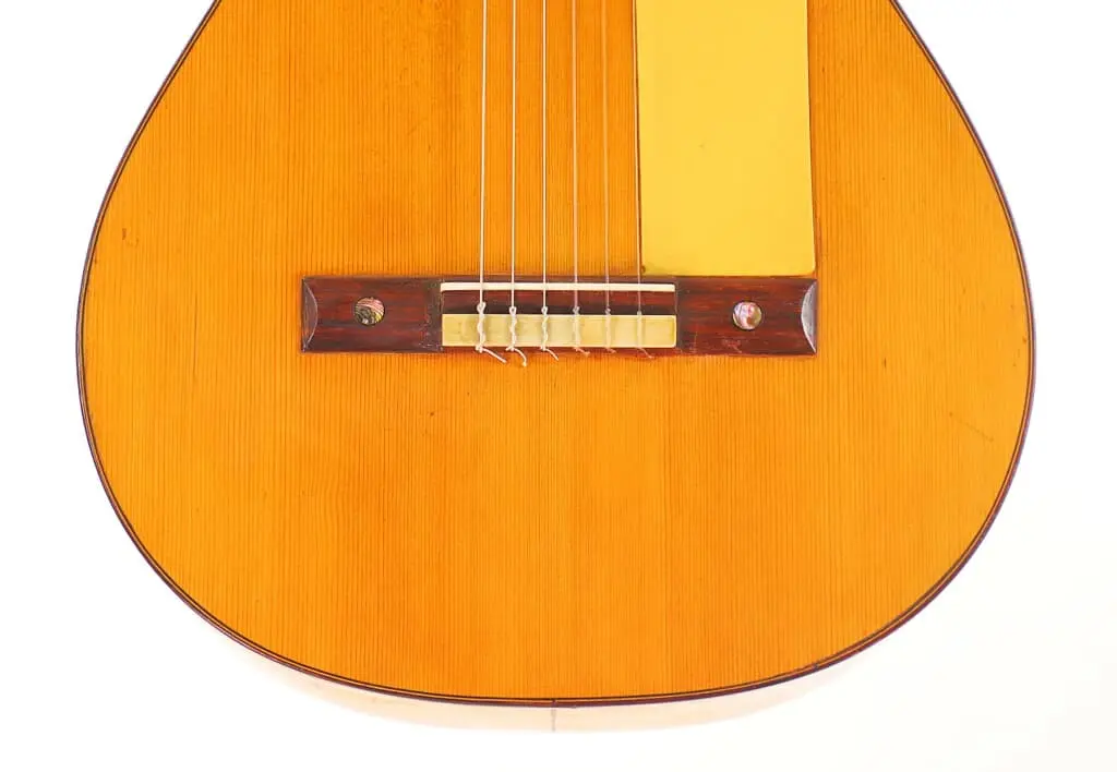 This is a superb and extremely nice sounding guitar from Manuel Ramirez’ shop. Manuel Ramirez’s shop was renowned for being the best workshop at the turn of the century – this guitar is a great example of the quality they produced – it is simply exquisite for its quality of sound. While every note is rich in overtones, it retains an almost unbelievable degree of separation and clarity between voices. Due to its ultra-lightweight build, the production of sound is immediate, with an ample amount of tonal modulation and dynamic range. This guitar also boasts great power, which will immediately put to rest any rumor that old guitars don’t have much sound!