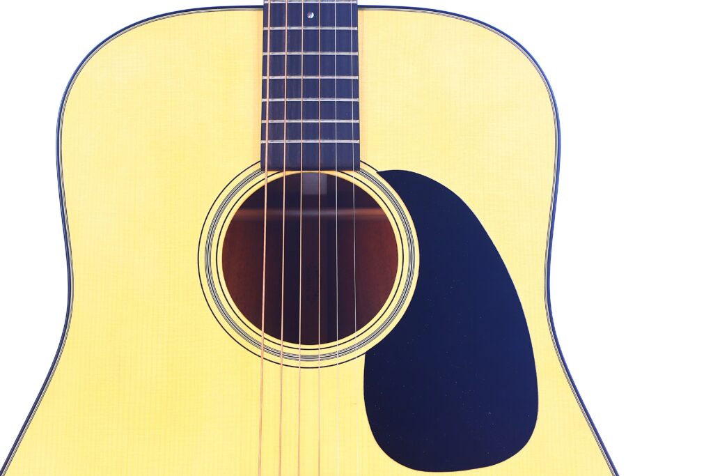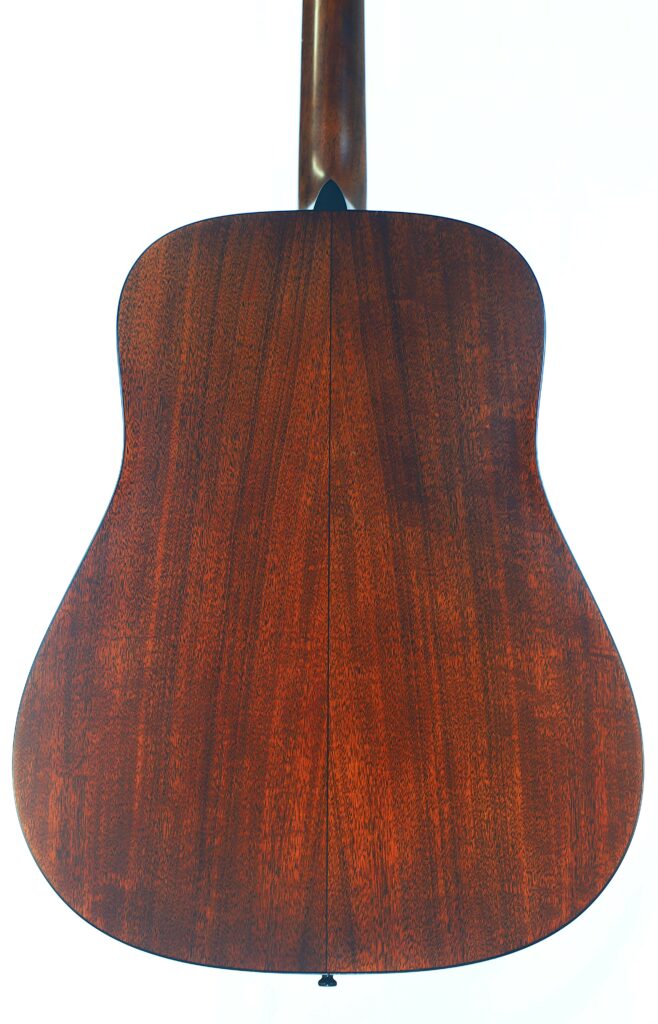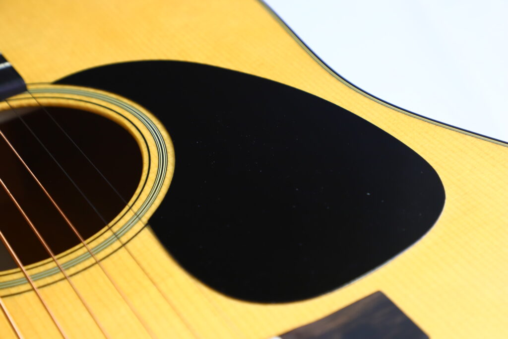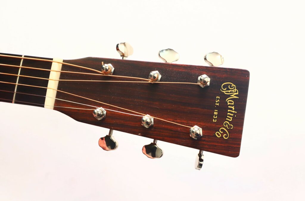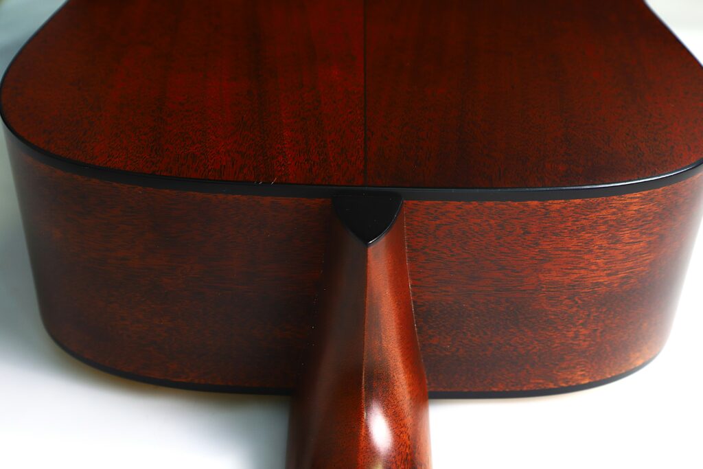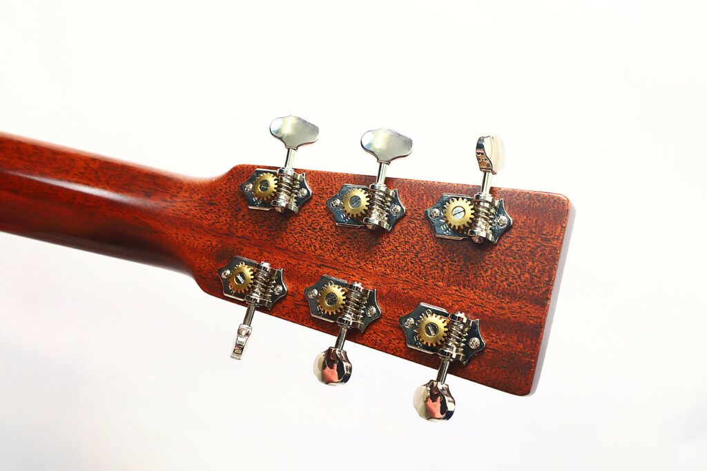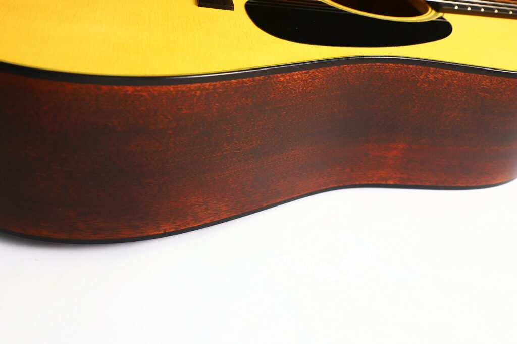 The mahogany body contributes warm midrange frequencies that beautifully complement the bright tones of the spruce top. The wood’s grain reflects golden hues depending on the light, adding a gentle warmth to the overall sound.