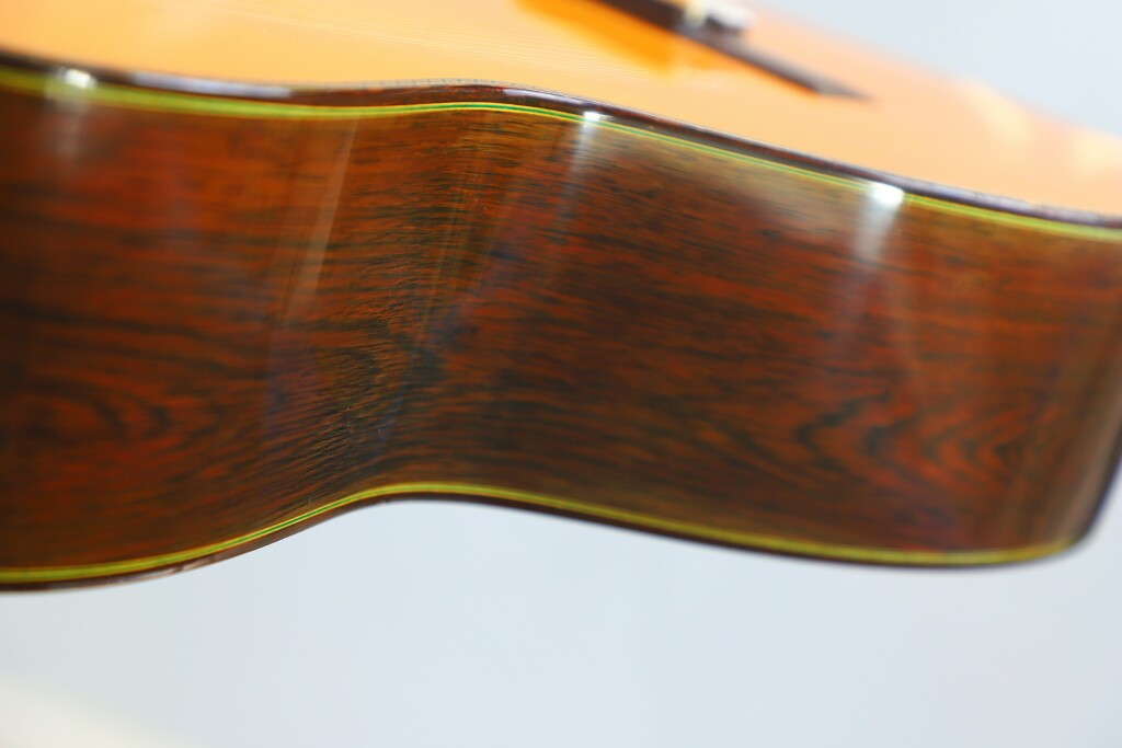 The sound of this Kohno is simply breathtaking. It has the unmistakable clarity and warmth characteristic of his best guitars from this era. The tone is woody, rich, and deeply resonant, with a refined darkness that adds a layer of mystery and sophistication. The guitar is exceptionally powerful, projecting beautifully with long-lasting sustain that seems to carry each note effortlessly through the air. It fills the room with a mesmerizing variety of tonal colors, offering an incredibly nuanced and expressive sound. Every detail, from the deep, full-bodied basses to the crystalline, singing trebles, is finely balanced and masterfully articulated. Built in the Spanish tradition, it possesses the distinctive voice that defines Kohno’s finest work—an instrument of rare elegance and sophistication, designed to meet the highest artistic demands.