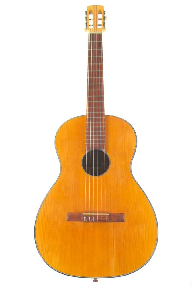 The guitar has a top made of German spruce, back and sides made of maple and a fingerboard made of rosewood. The scale length is 630 mm and the nut width is 50 mm. The guitar is in good condition and has a very wel repaired crack on the top. It is also equipped with an adjustable (Stauffer style) neck.