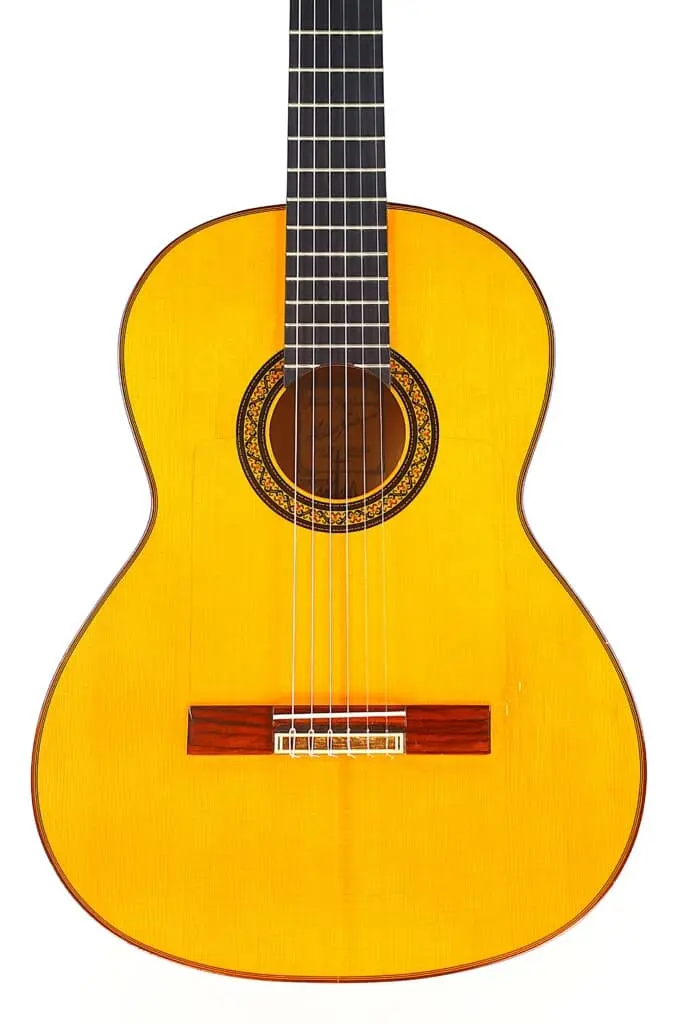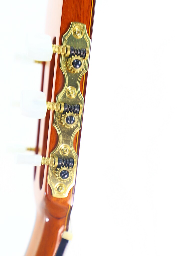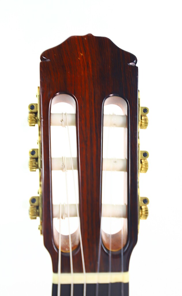 This guitar by Melchor Rodriguez was built in the style of a Jose Ramirez flamenco guitar. The guitar has a spruce top and cypress back and sides. The scale length is 650 mm and the nut width 52 mm. It plays great with a low action (2.6 mm E and 2.1 mm e at the 12th fret) and a straight neck.