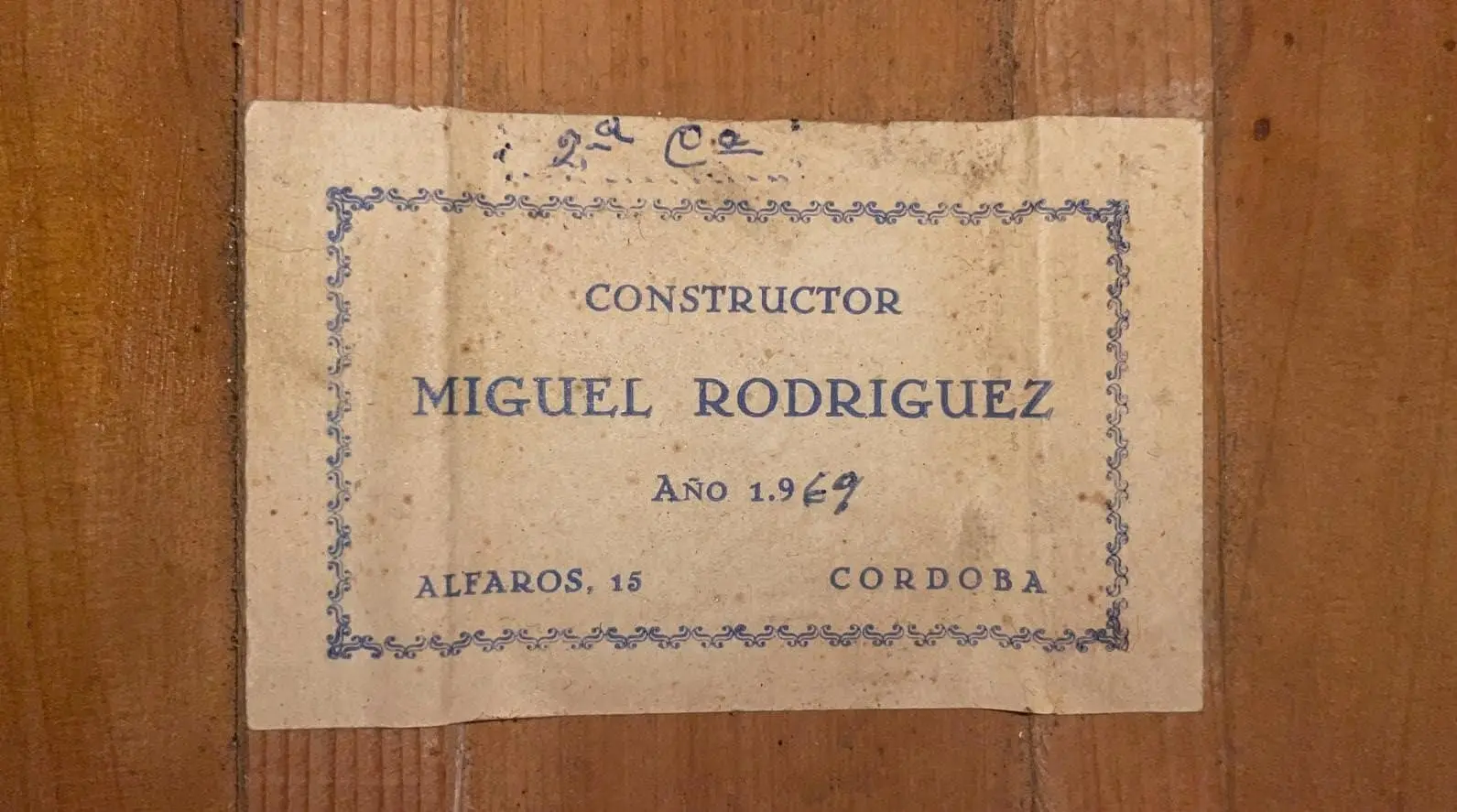 This flamenco guitar was made in the workshop of legendary guitar maker Miguel Rodríguez, located in 15 Alfaros Street (Córdoba).
