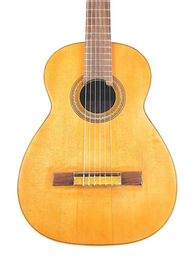 The guitar was built around 1940. It has a spruce top and the back and sides are made of rosewood. Its a smaller guitar with a scale length of 615 mm and a nut width of 51 mm.