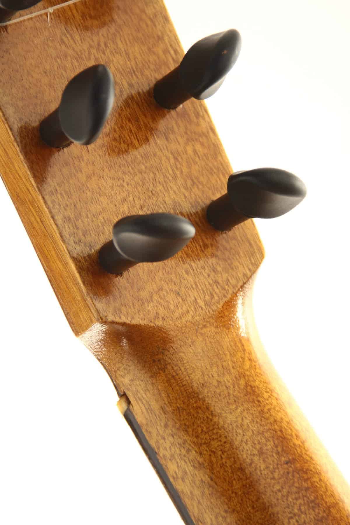 It is a pleasantly light guitar, finely built with a nicely coloured rosette, a straigt forward design and a smooth and fluid headstock shape.