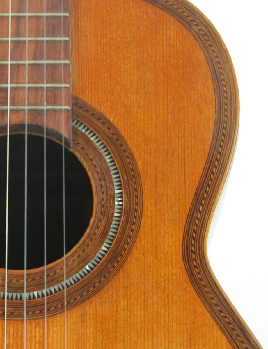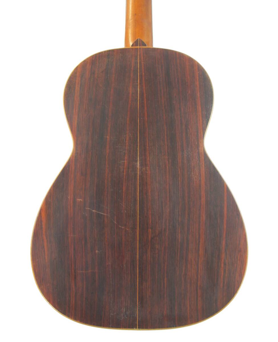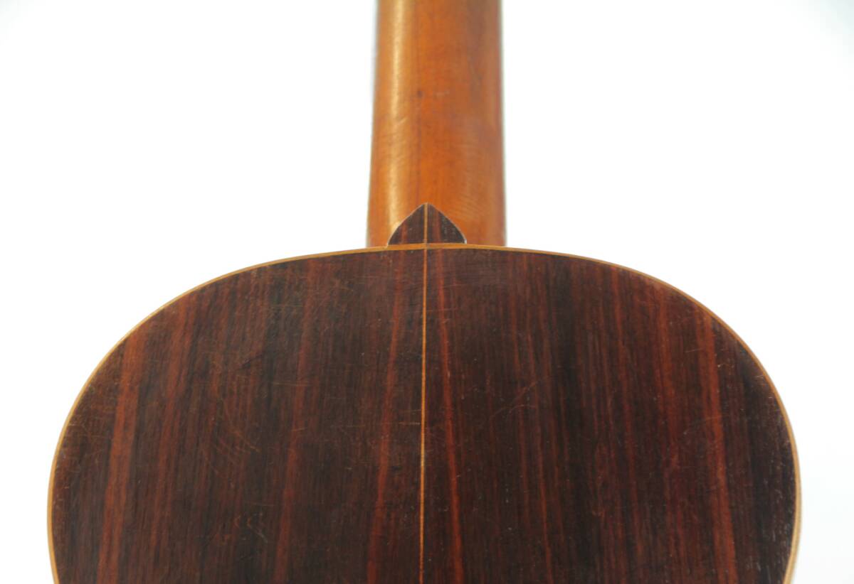 The guitar is in a lightly restored and well playable condition. The scale lenghts is 646 mm and the nut width 50 mm. The top is of fine spruce and the back and sides of very beautiful and high quality rosewood.