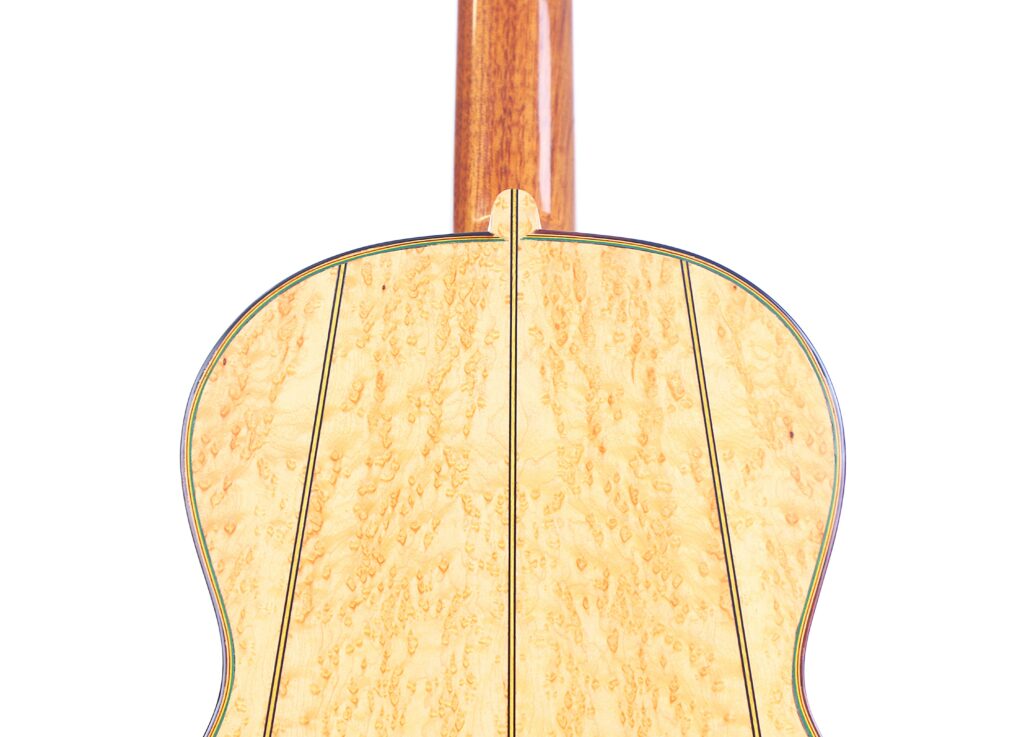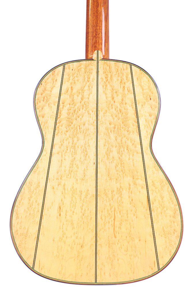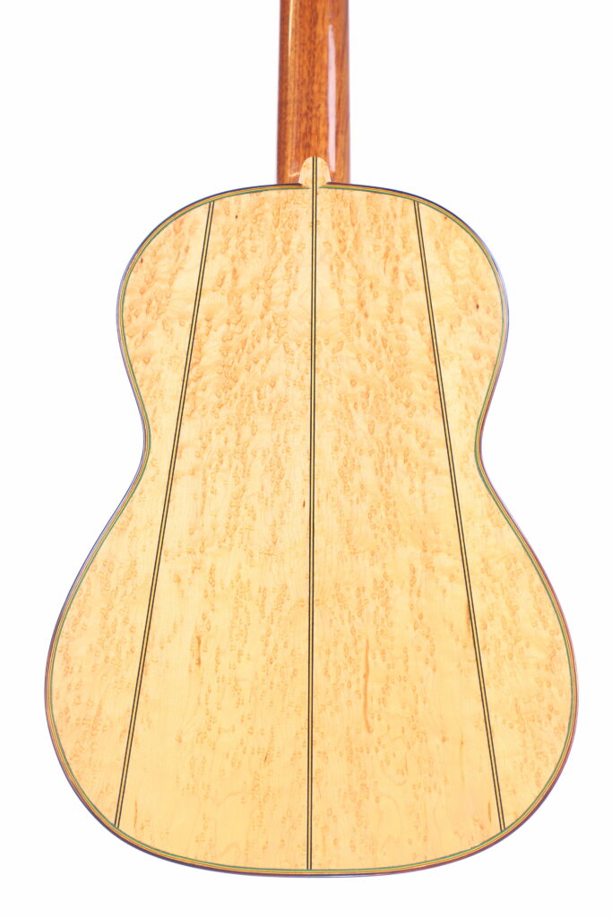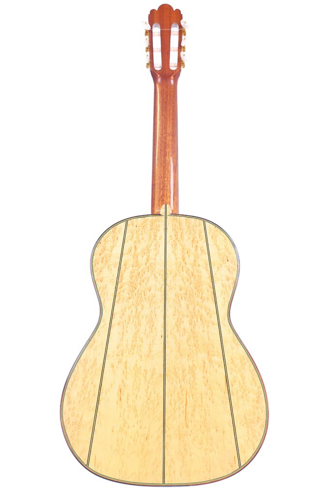 This beautifully crafted guitar is a replica of the famous La Leona (FE 04) by Antonio de Torres. It has a fine spruce top and a very beautiful back made of birdseye maple – definitelly the most spectacular maple we have seen so far. The sides are also made of the same birdseye maple. The guitar has a scale length of 650 mm and a nut width of 51 mm. This guitar plays great with a low action (3.7 mm E and 2.8 mm e at the 12th fret) and a straight neck.