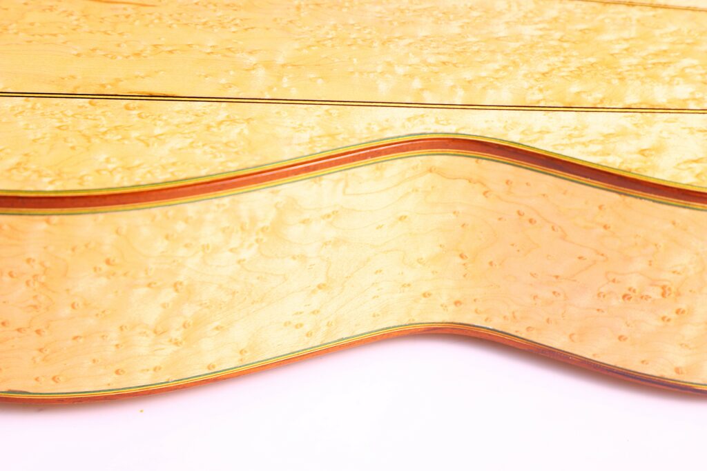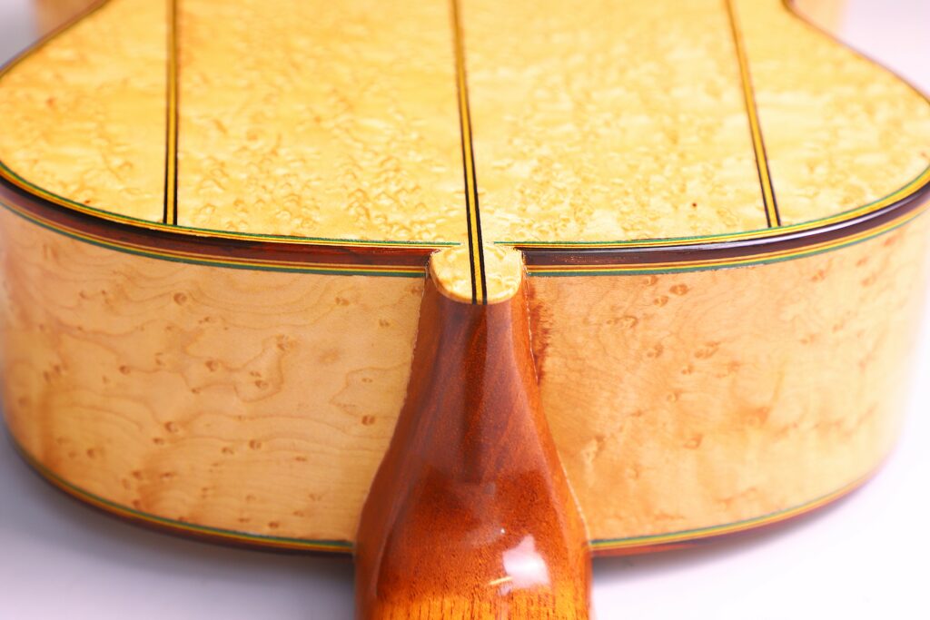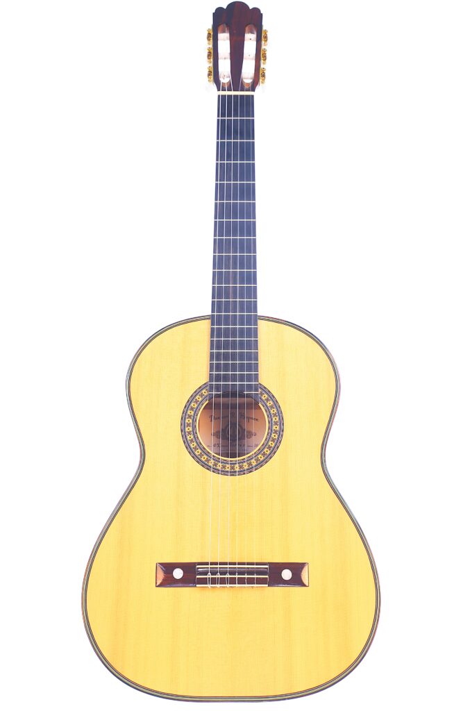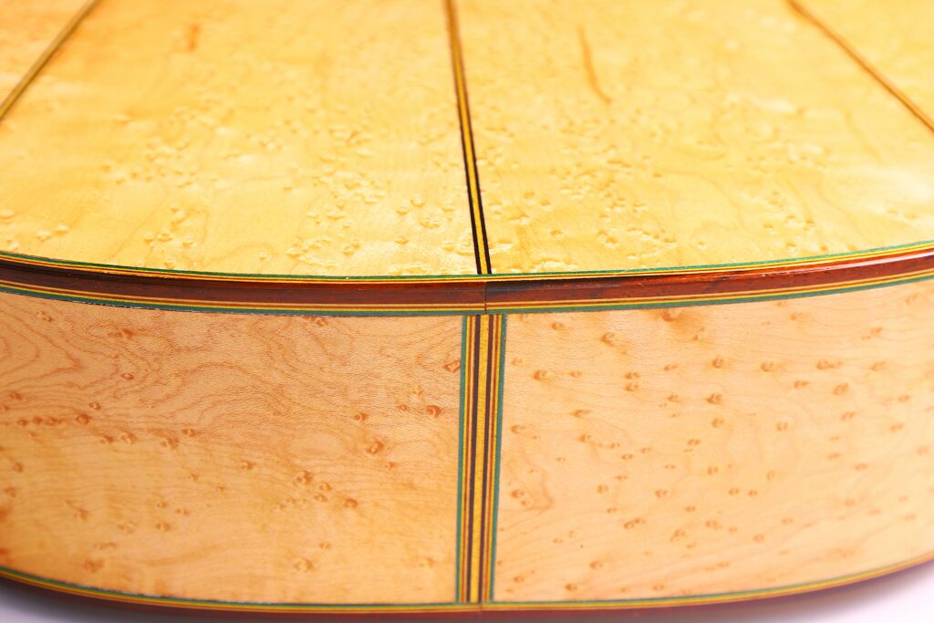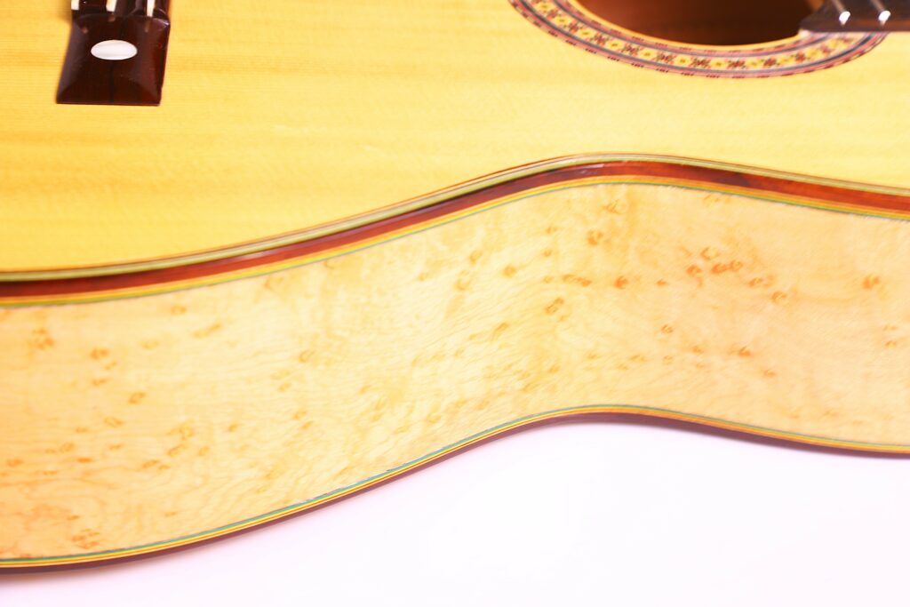 This beautifully crafted guitar is a replica of the famous La Leona (FE 04) by Antonio de Torres. It has a fine spruce top and a very beautiful back made of birdseye maple – definitelly the most spectacular maple we have seen so far. The sides are also made of the same birdseye maple. The guitar has a scale length of 650 mm and a nut width of 51 mm. This guitar plays great with a low action (3.7 mm E and 2.8 mm e at the 12th fret) and a straight neck.